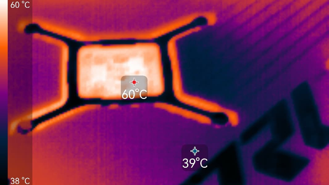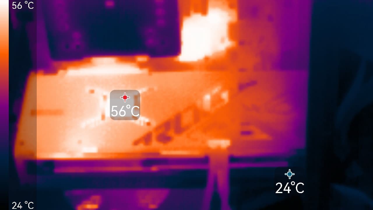 После 2-часового прогона под нагрузкой в режиме Performance максимальная температура ядра не превысила 63 градусов, а памяти — 66 °C, что является отличным результатом для видеокарт высокого уровня. Энергопотребление карты доходило до 286 Вт (пиковое 328 Вт), а вентиляторы работали на уровне 1460 об/мин. Температура нагрева самой горячей точки ГП (hot spot) составляла 78 °C.