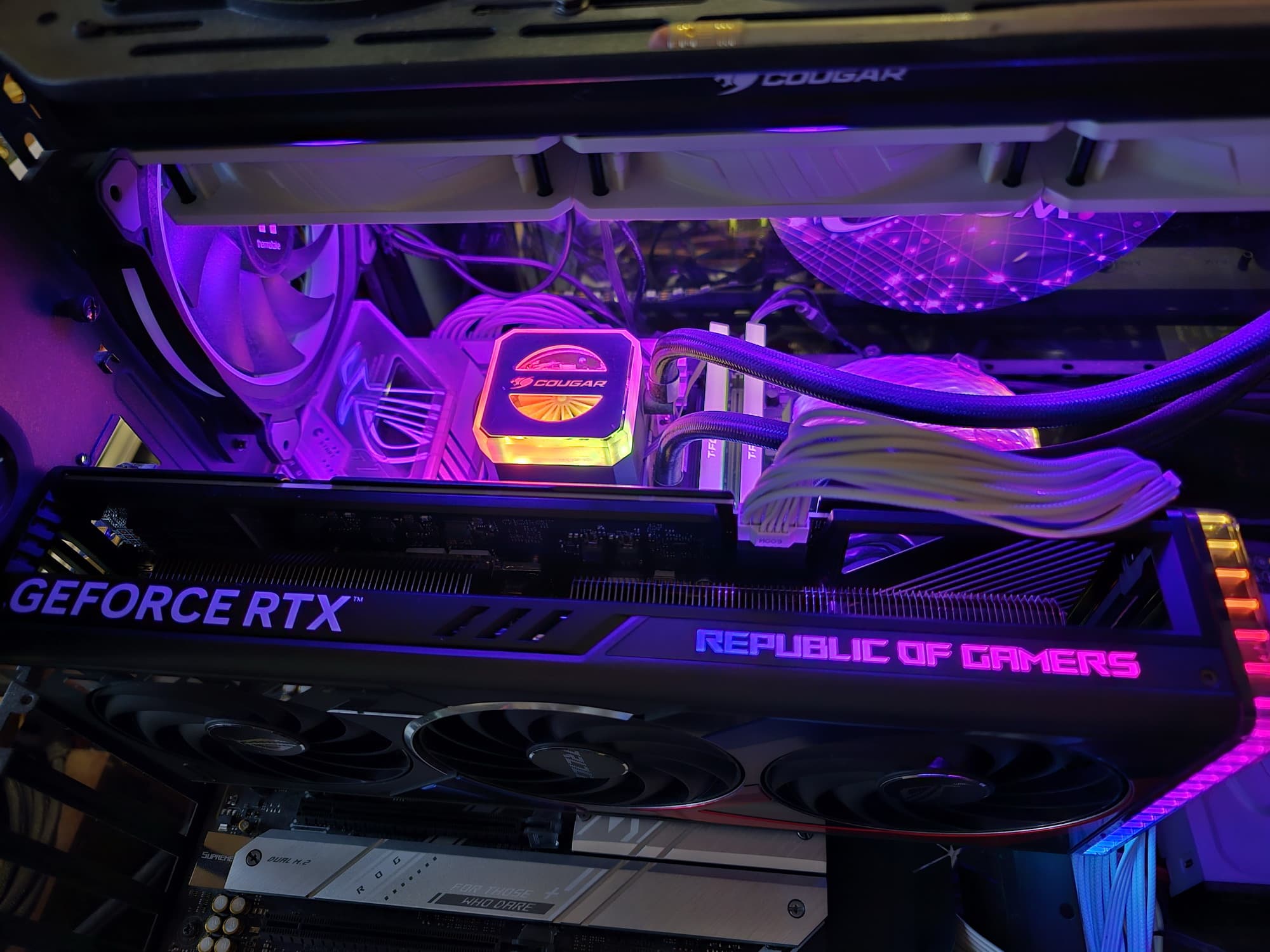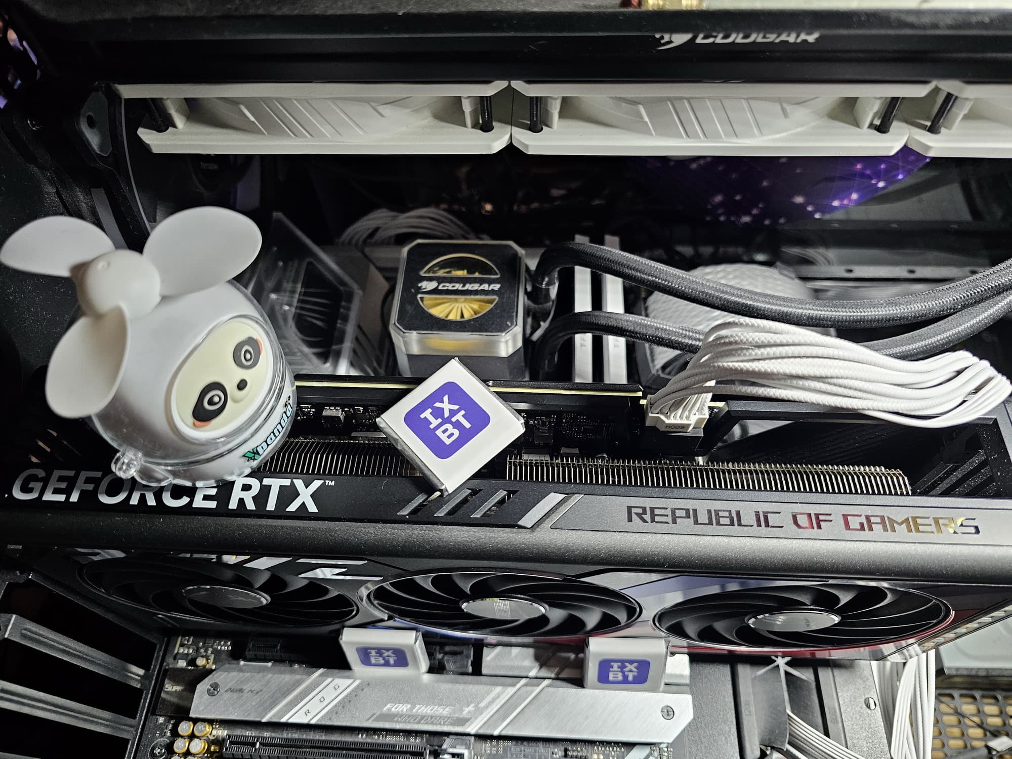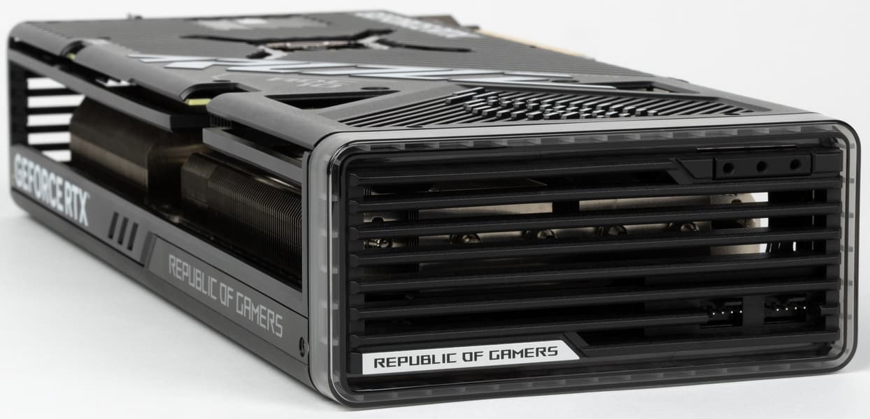 Еще одним отличием разводки данной карты от той, что относится к семейству TUF Gaming, является возможность подключения корпусных вентиляторов, что присуще всем видеокартам линейки ROG Strix. На заднем торце имеются два 4-контактных разъема для подключения любых стандартных вентиляторов, управляемых через PWM, их обороты будут зависеть от нагрева видеокарты. Кожух кулера значительно длиннее PCB самой карты, так что для подключения указанных разъемов вентиляторов к карте используются внутренние кабели.