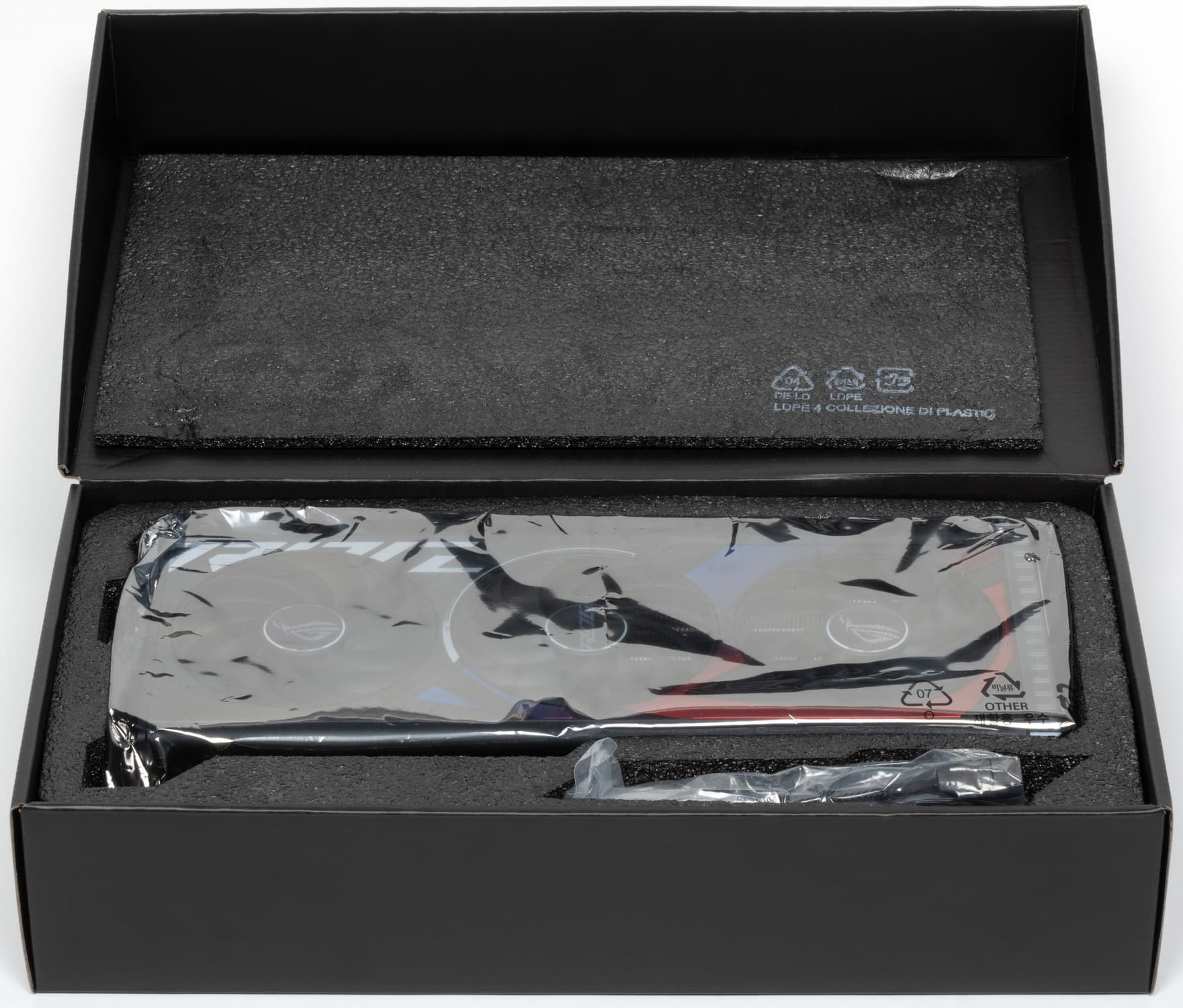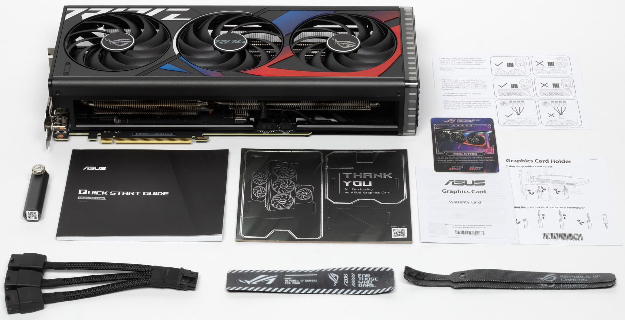 В комплекте поставки кроме традиционного краткого руководства пользователя также имеются переходник питания с трех 8-контактных разъемов на один 16-контактный, раздвижная подставка/отвертка, фирменные стяжка, картонный сувенир и карточка клуба ROG.