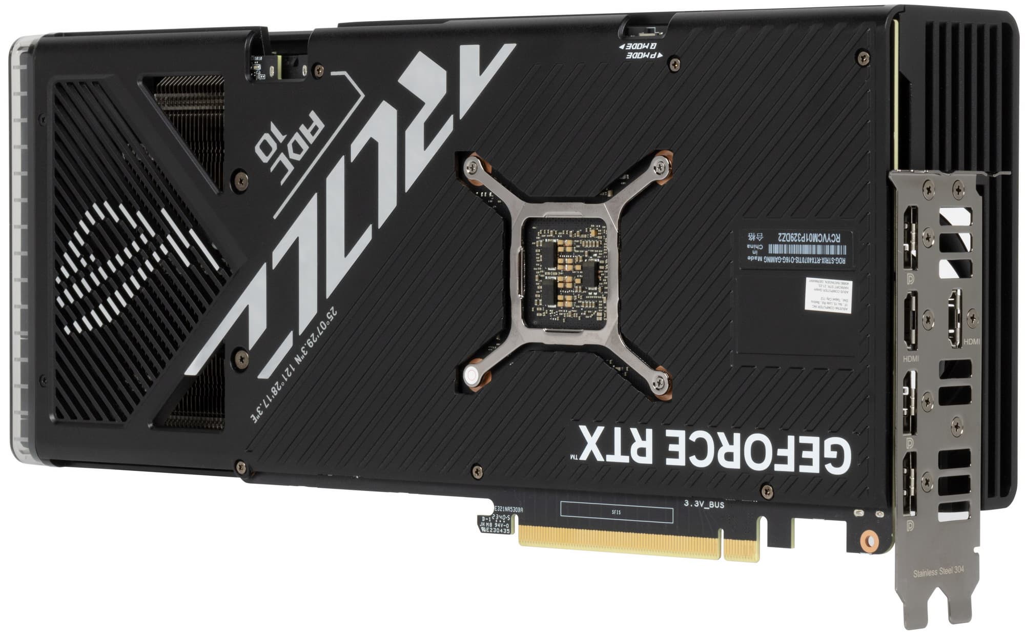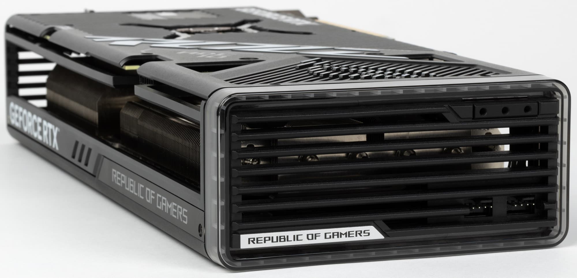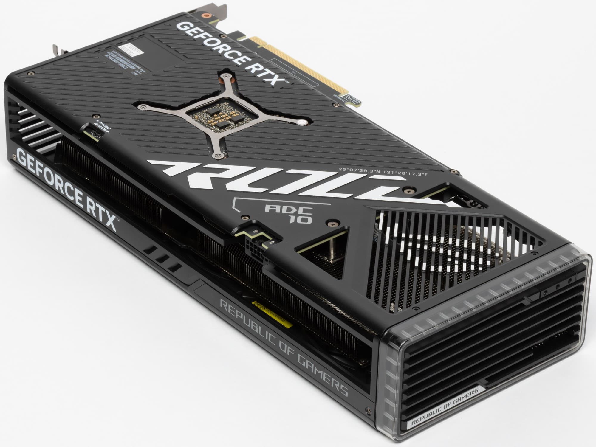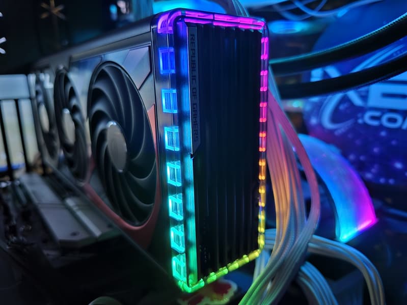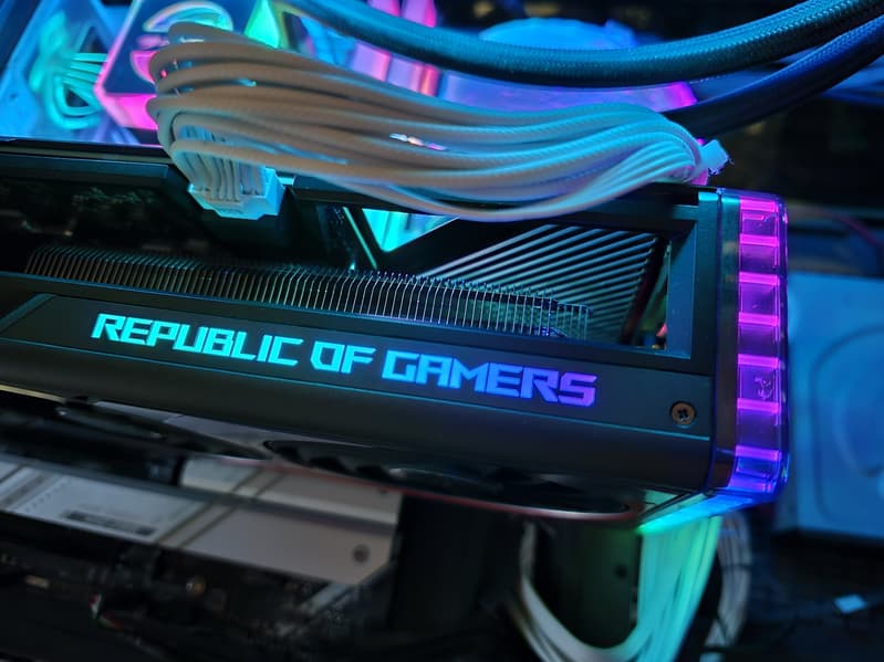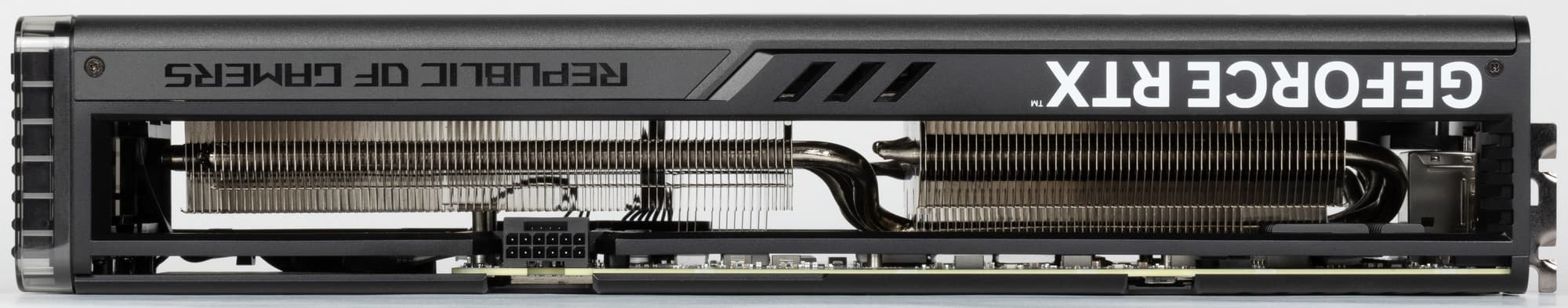Подсветка у карты реализована в торцевой вставке, а также в логотипе семейства ROG на верхнем торце карты.