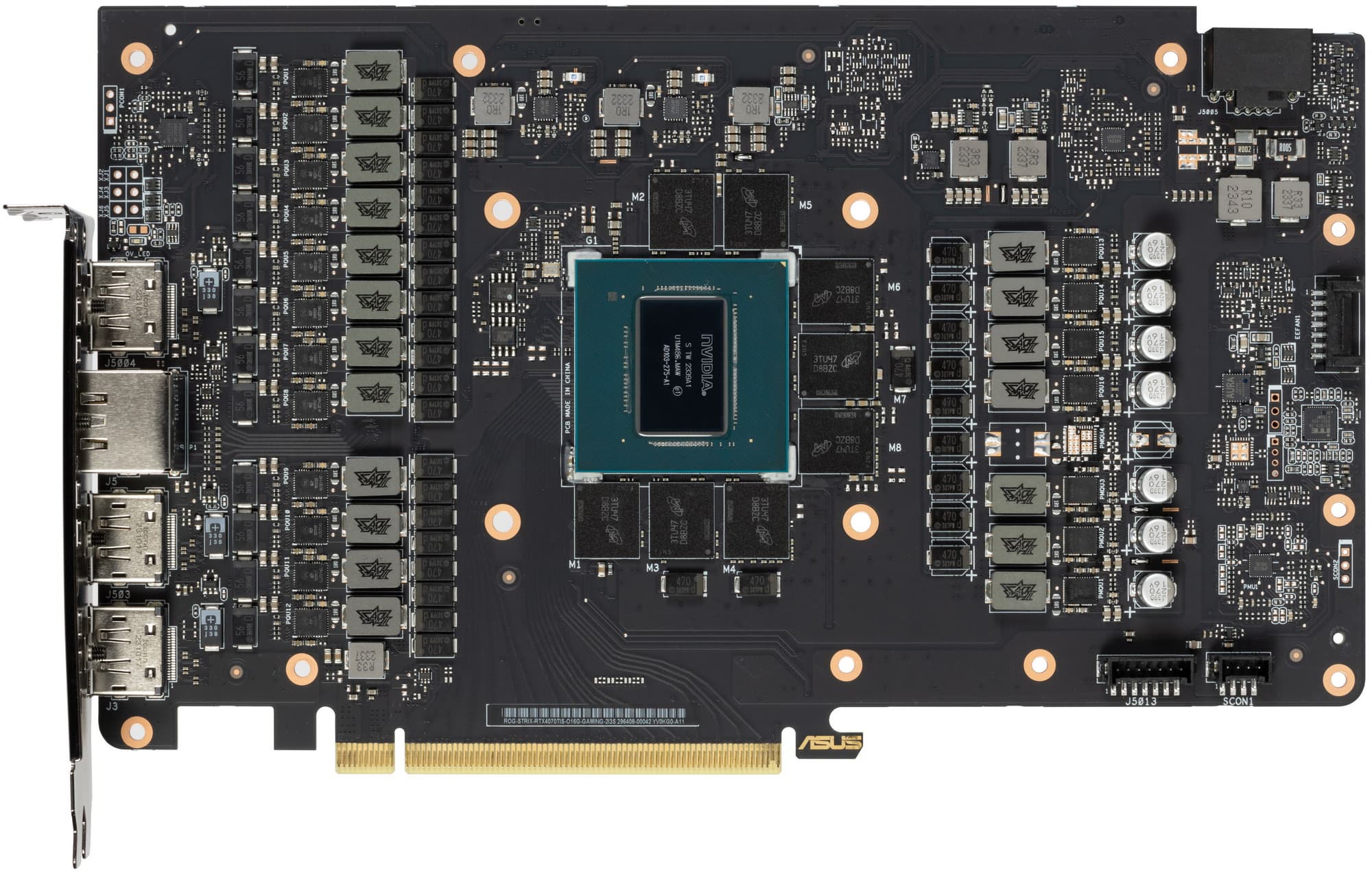 Взятые для сравнения видеокарты относятся у Asus к разным игровым линейкам (TUF Gaming и ROG Strix), что хорошо видно по разводке. Блоки с GPU и микросхемами памяти у этих карт повернуты друг относительно друга на 90 градусов, но это просто разные ревизии эталонного дизайна — ранее мы встречали подобное отличие даже в рамках карт на одном и том же GeForce RTX 4080. Зато отчетливо видно, что у продукта из семейства TUF Gaming посадочных мест под фазы питания больше, однако установлено их меньше, чем у продукта из семейства ROG. Это выглядит весьма логично, ибо количество фаз питания влияет на гибкость разгона ядра, и это важно для оверклокеров.