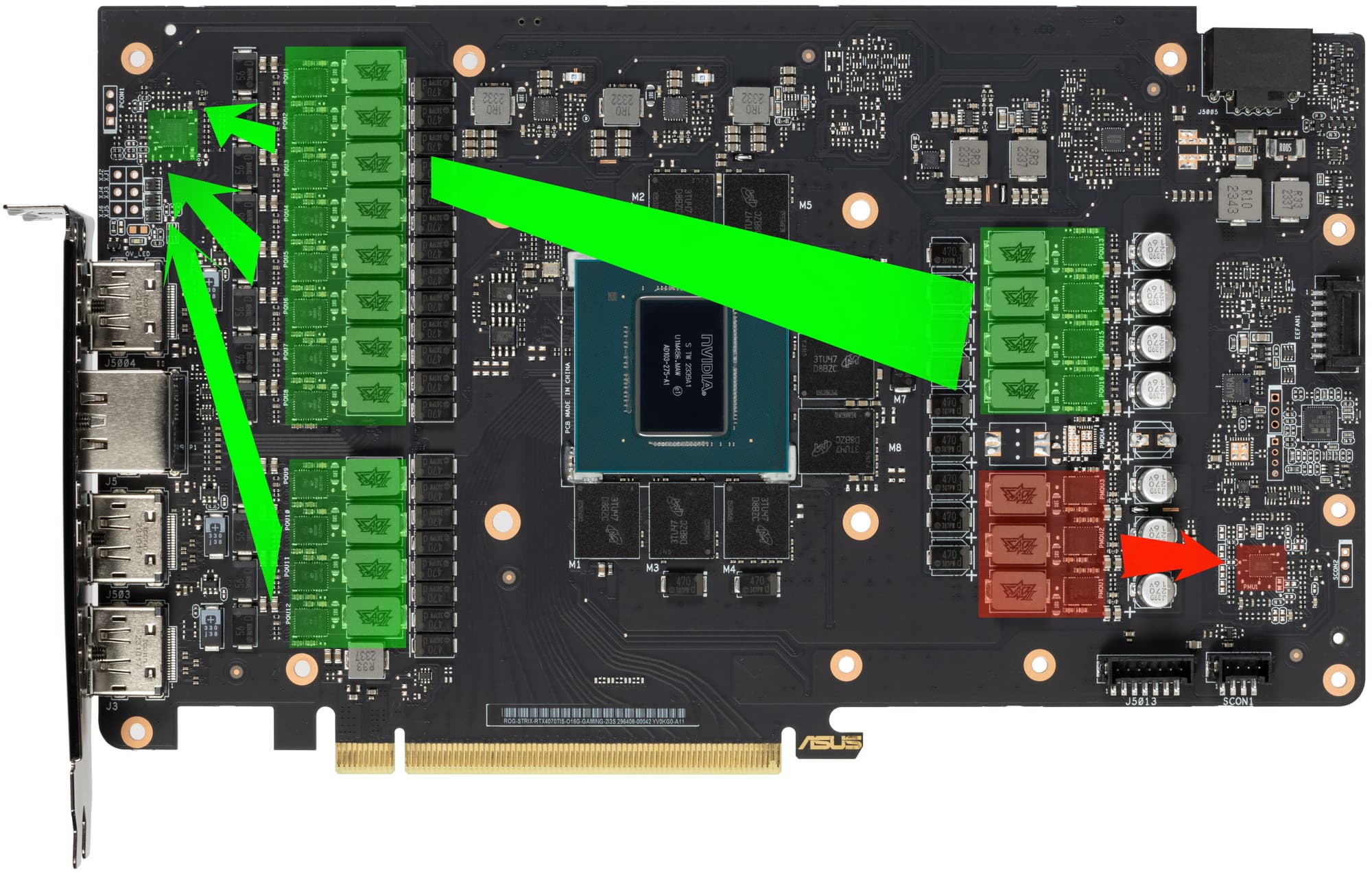 Зеленым цветом отмечена схема питания ядра, красным — памяти. Все ШИМ-контроллеры расположены на лицевой стороне PCB. Карта в сумме имеет 19 фаз питания (16+3).