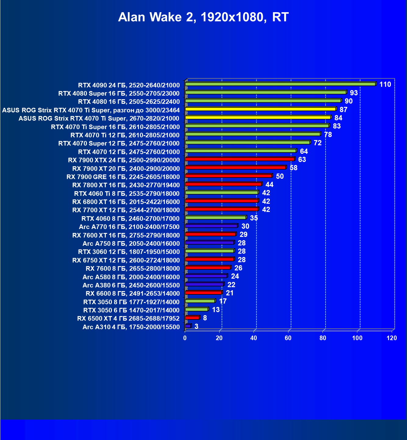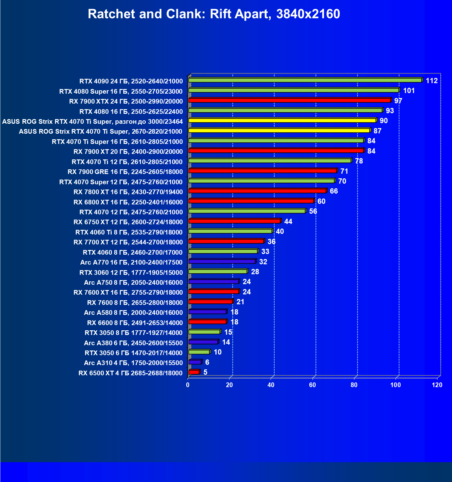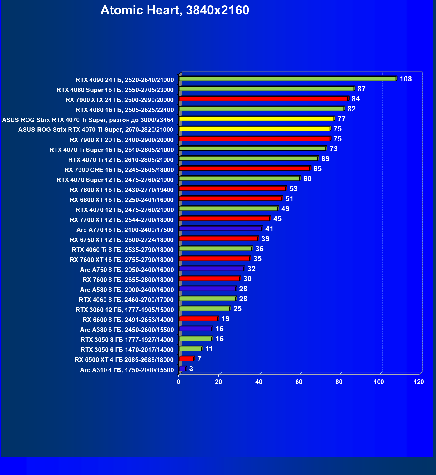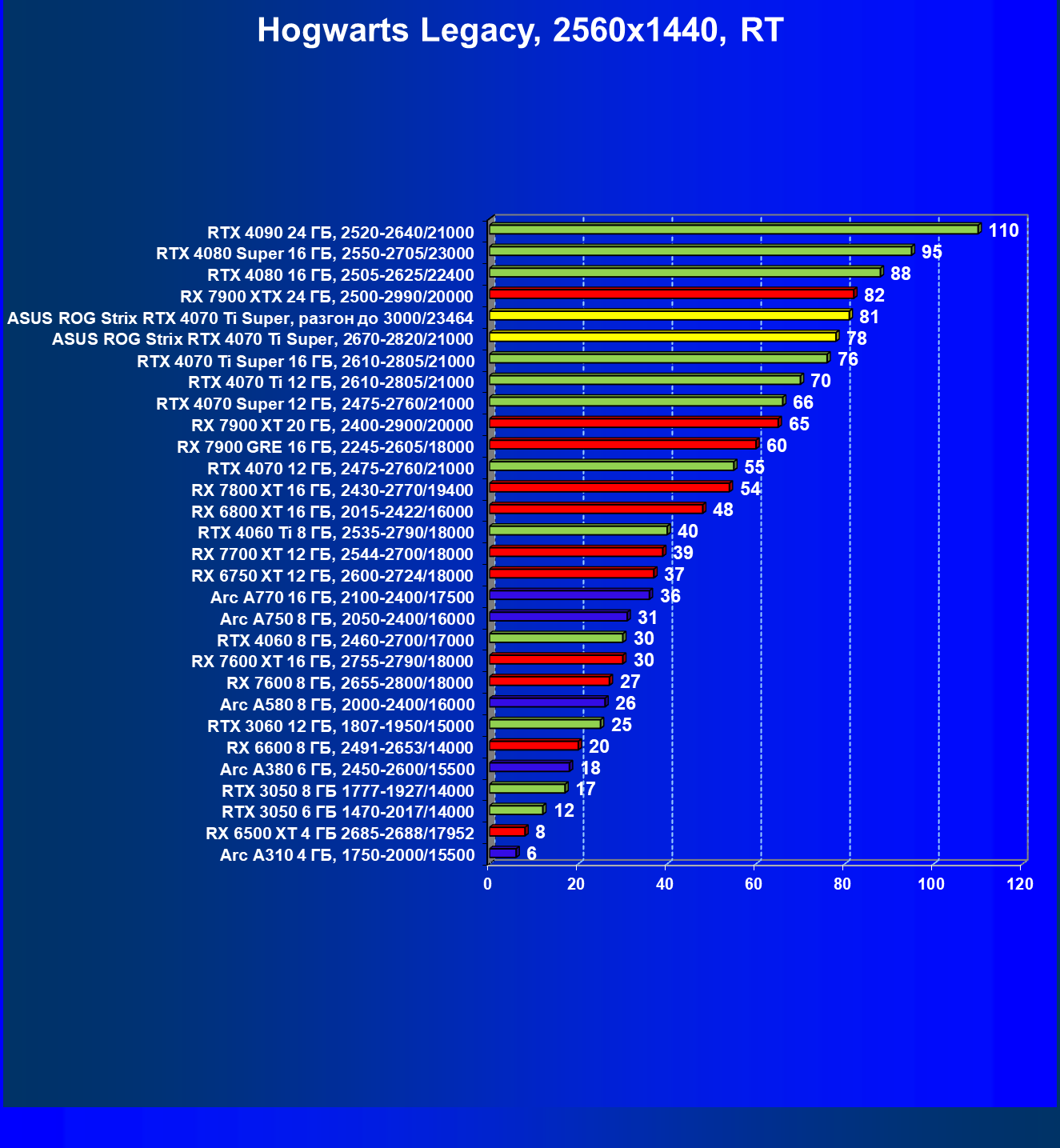 | 04 | Asus ROG Strix RTX 4070 Ti Super, разгон до 3000/23464 | 6103 | 555 | 110 000 |