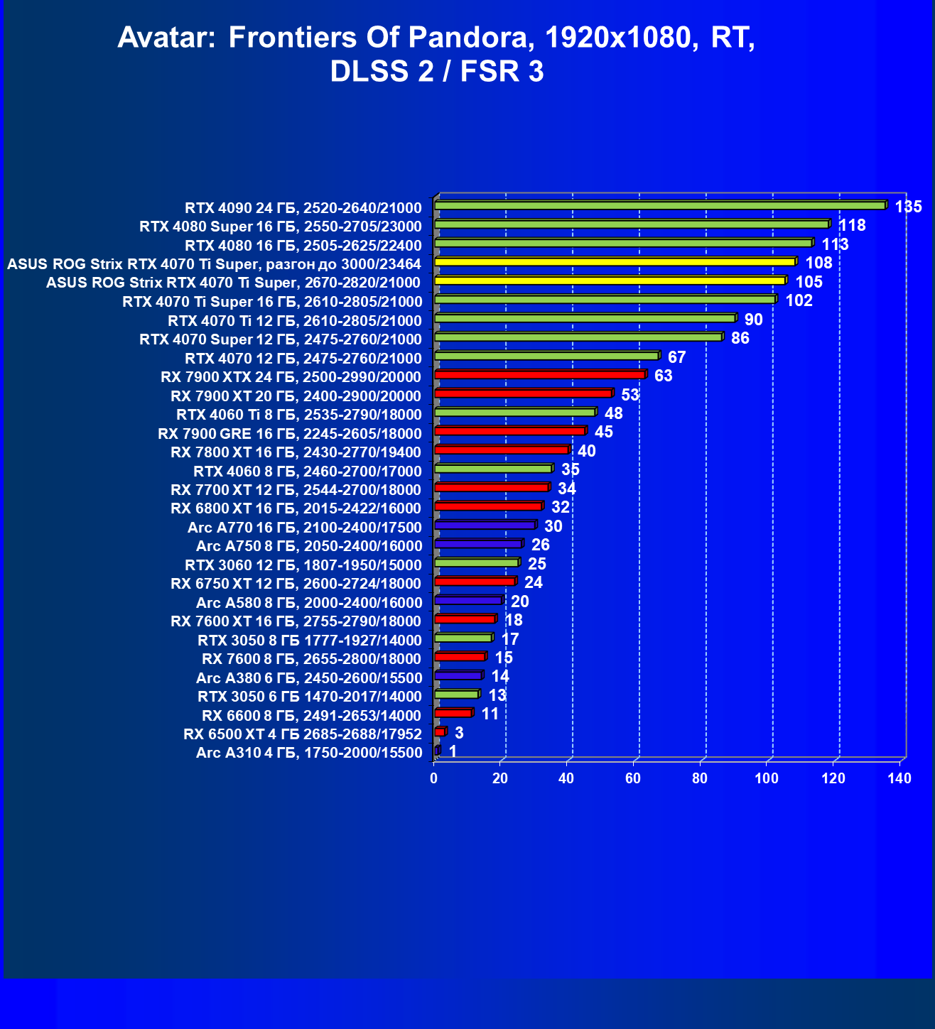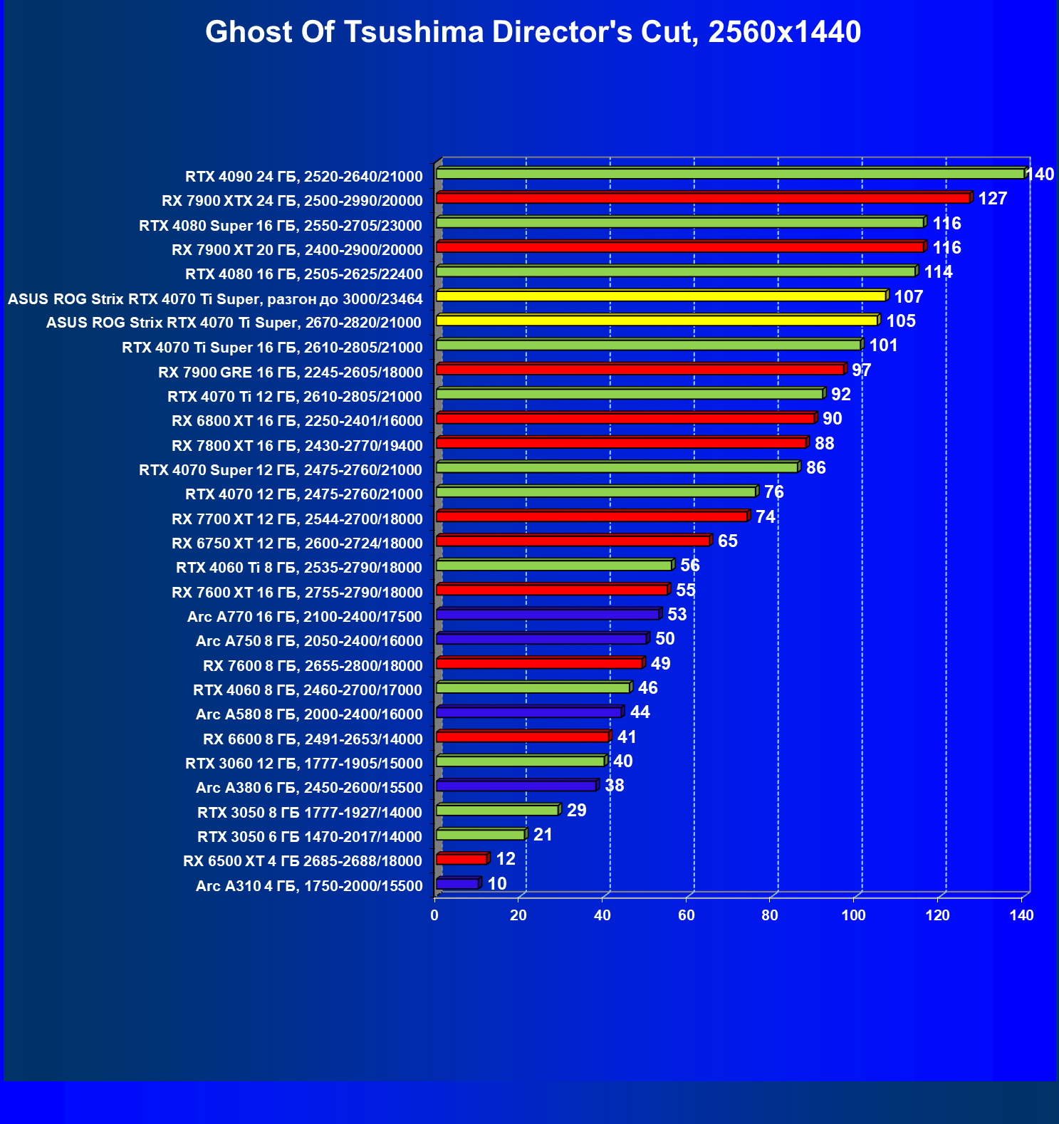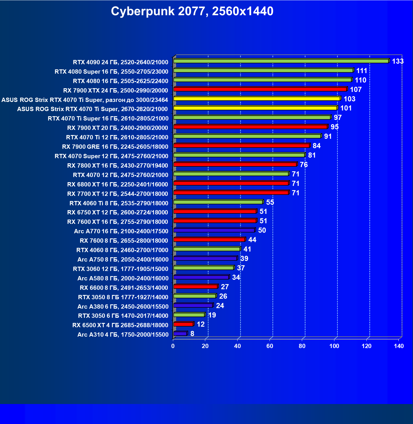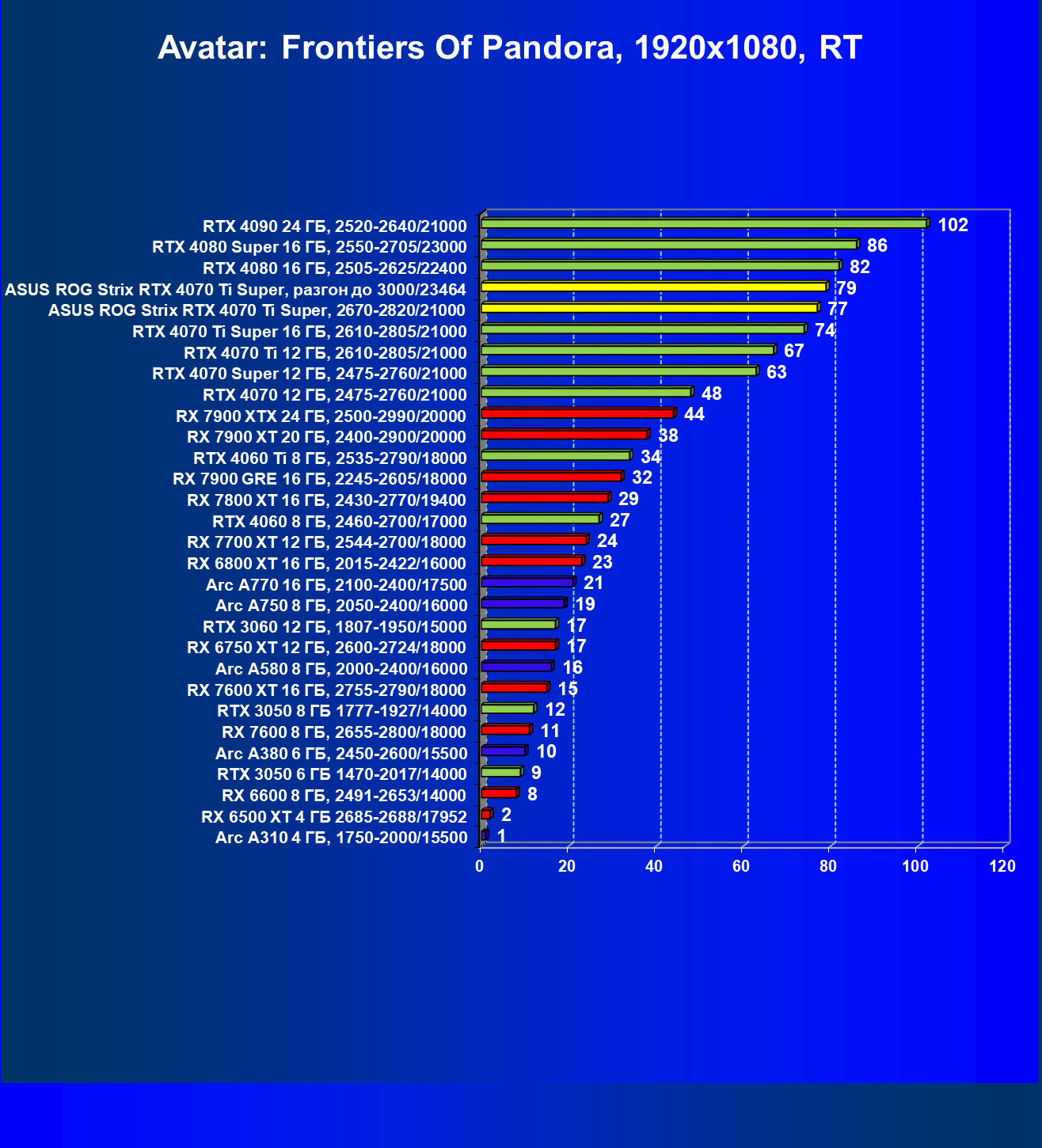 | 04 | Asus ROG Strix RTX 4070 Ti Super, разгон до 3000/23464 | 6103 | 555 | 110 000 |