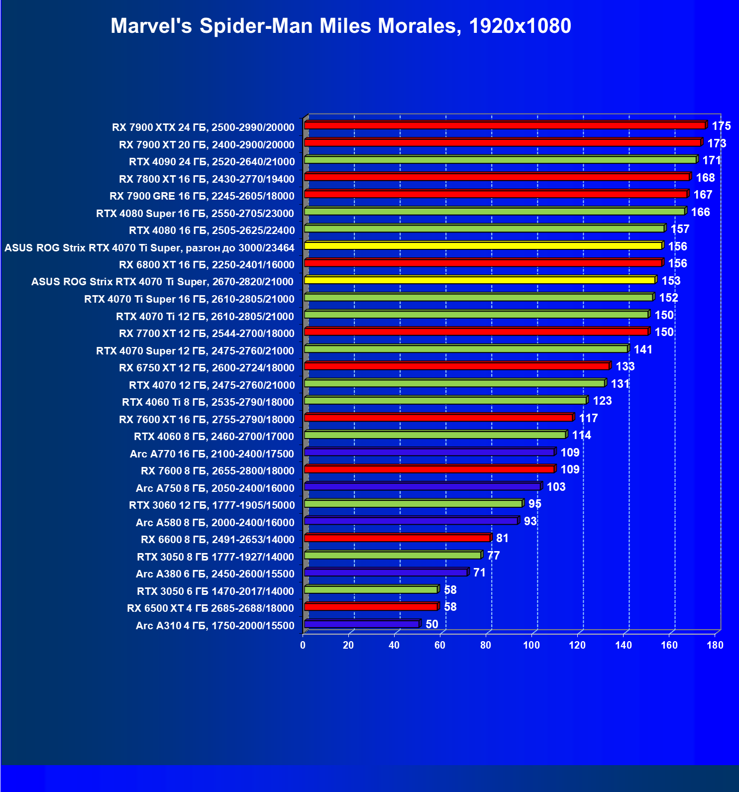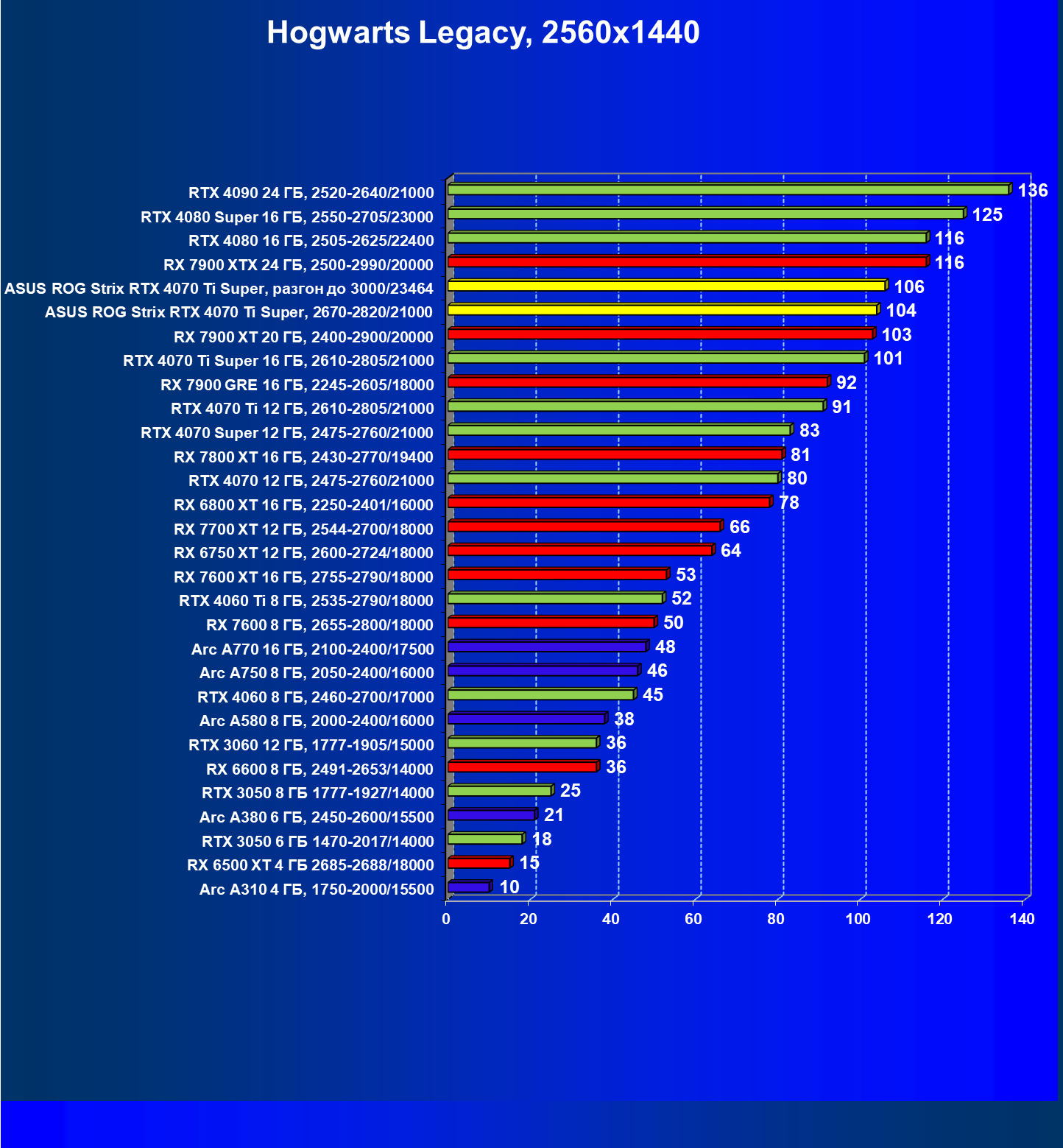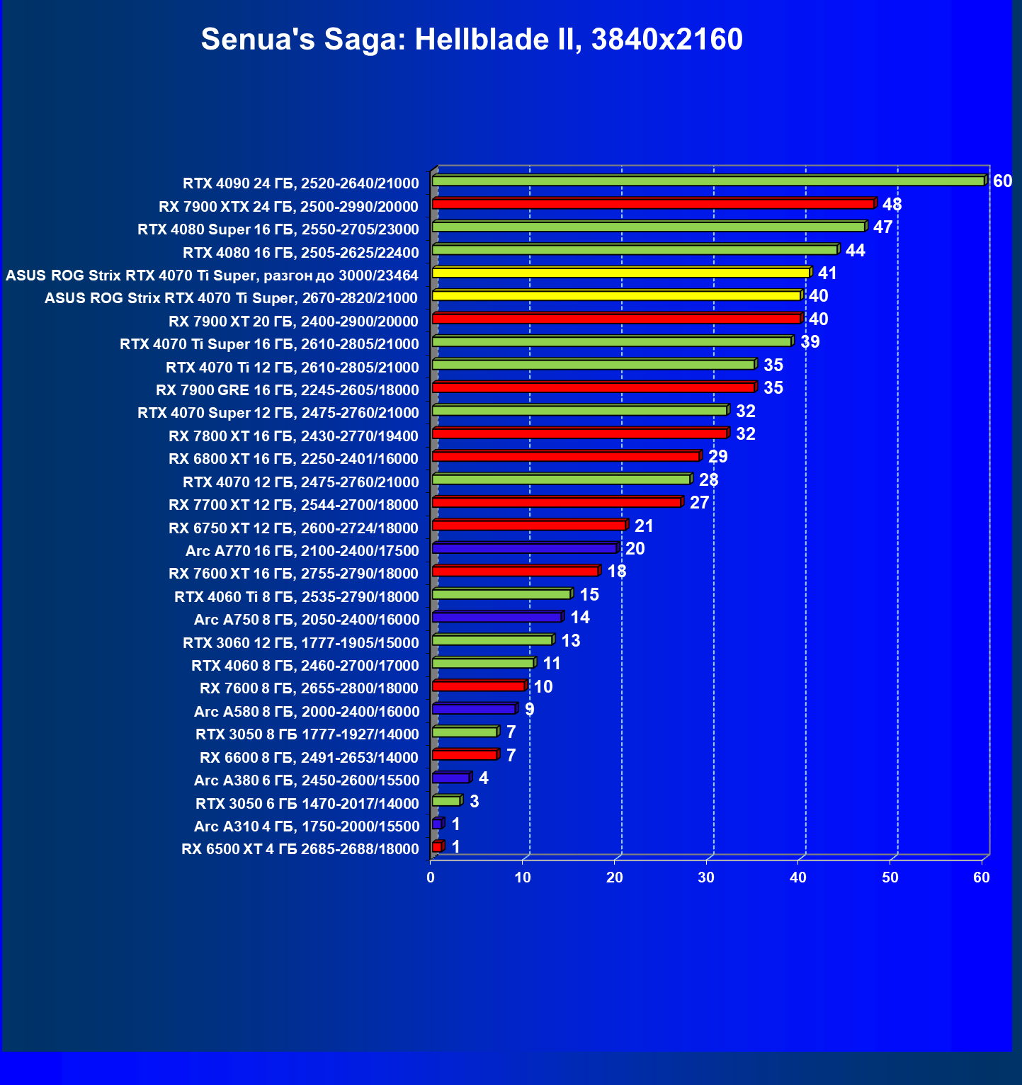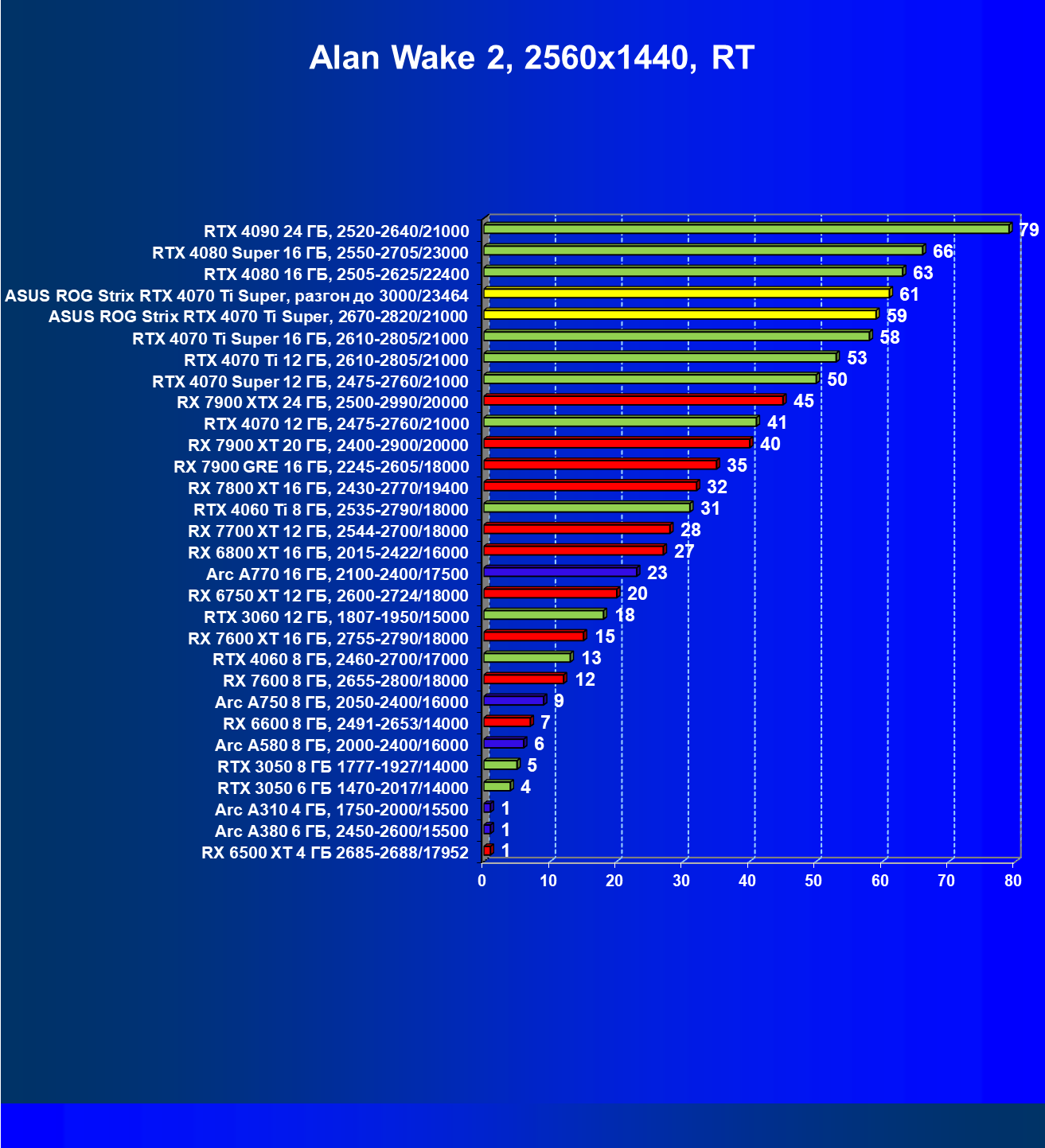 | 04 | Asus ROG Strix RTX 4070 Ti Super, разгон до 3000/23464 | 6103 | 555 | 110 000 |