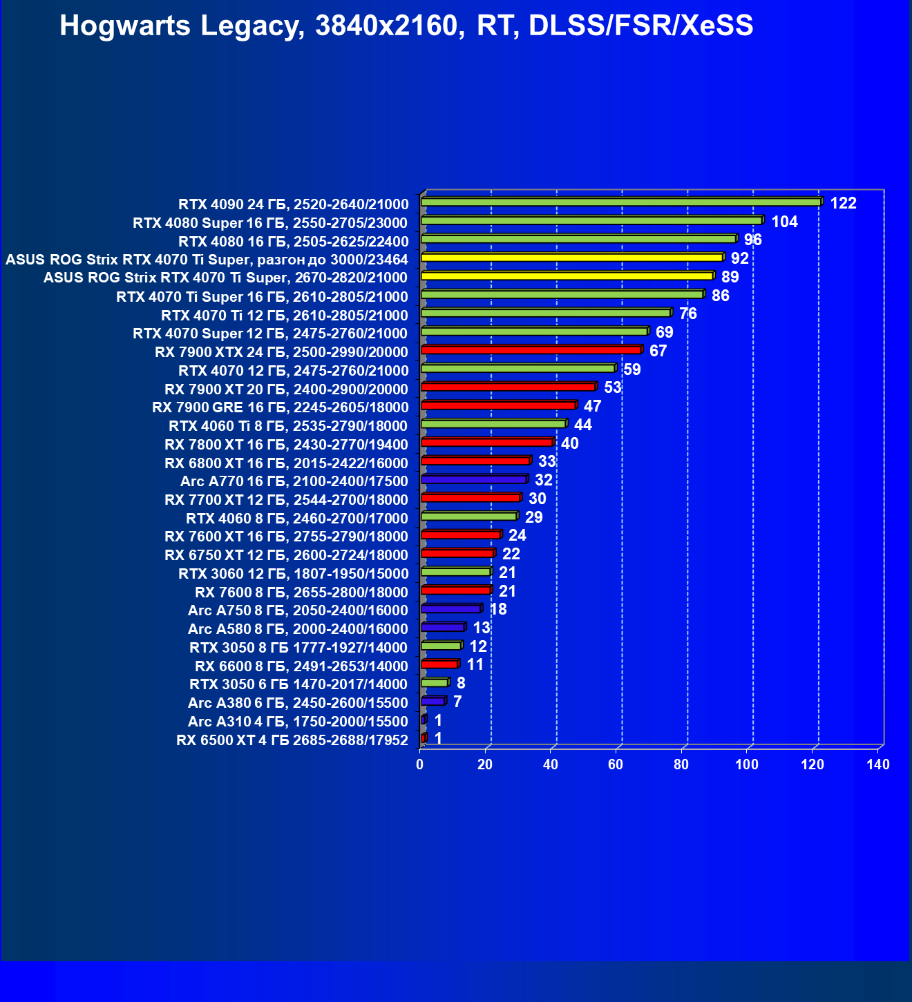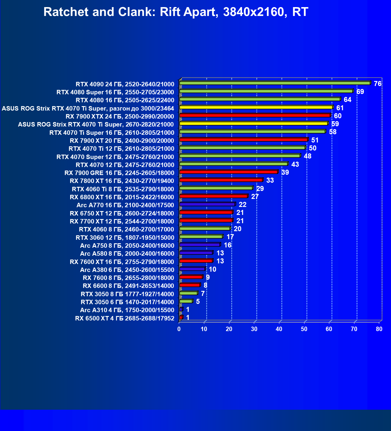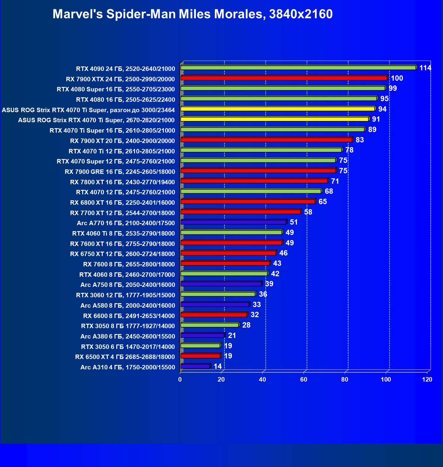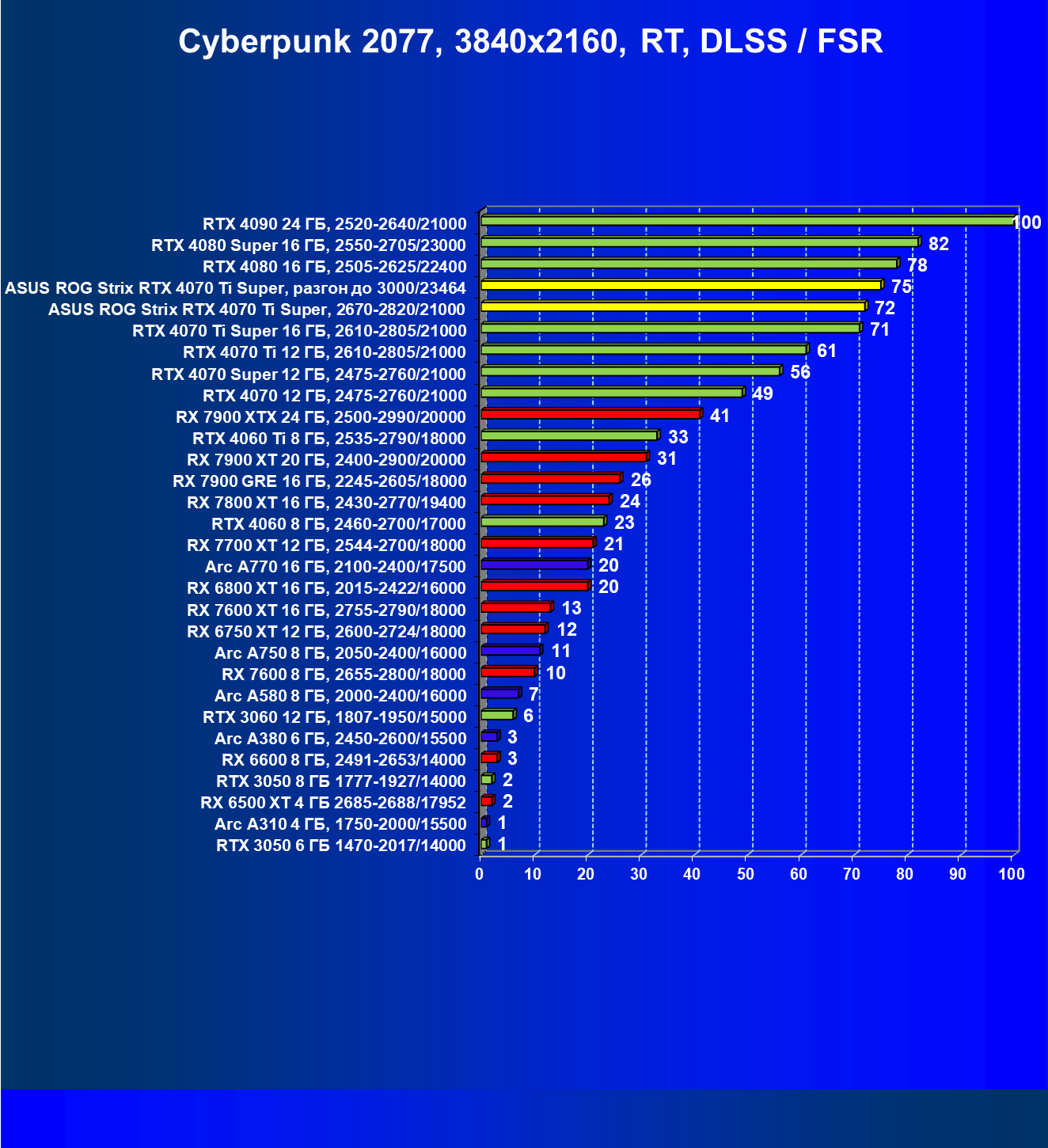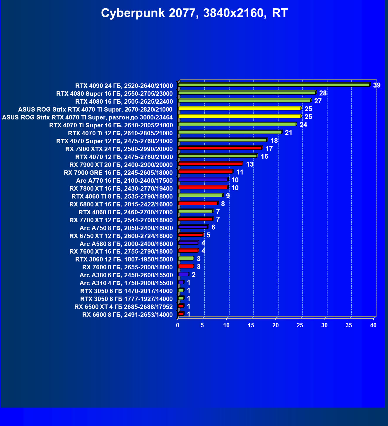| 23 | Asus ROG Strix RTX 4070 Ti Super, разгон до 3000/23464 | 271 | 2978 | 110 000 |