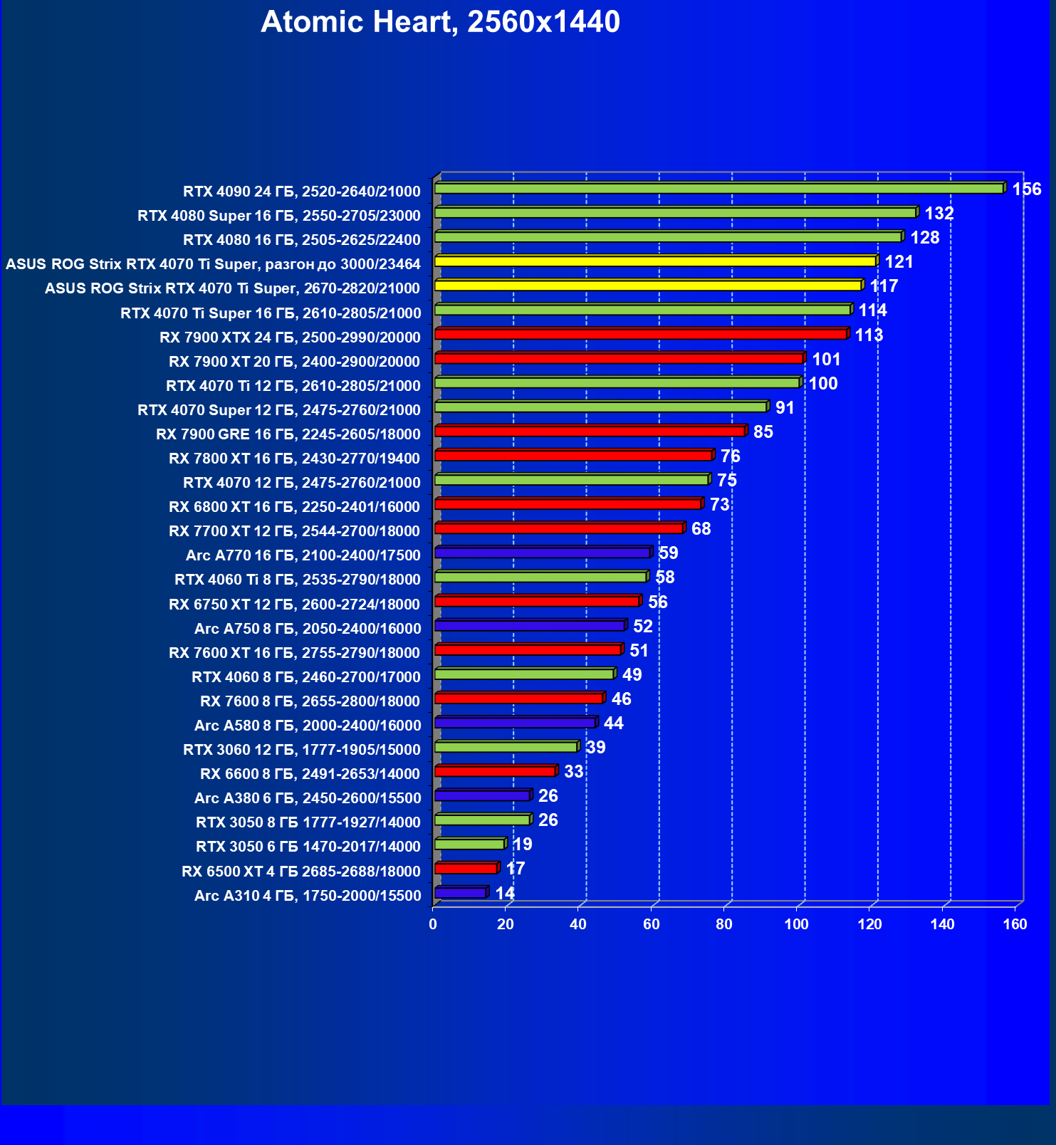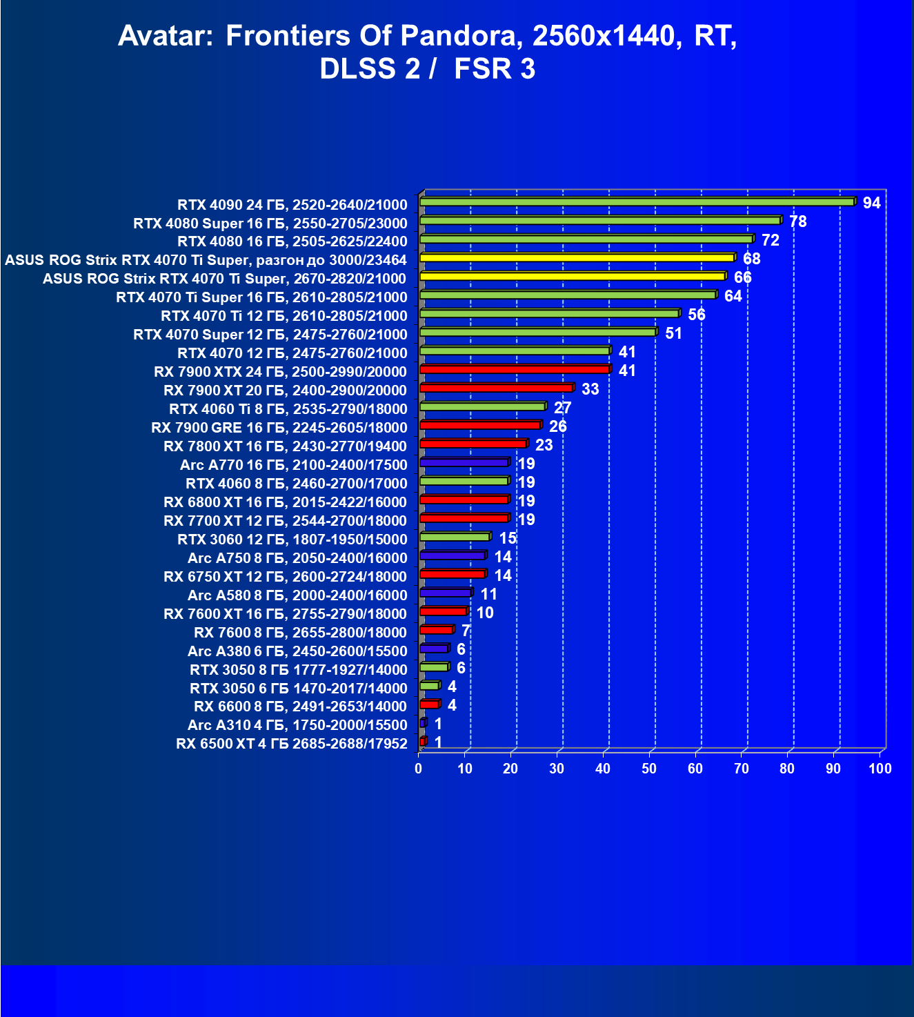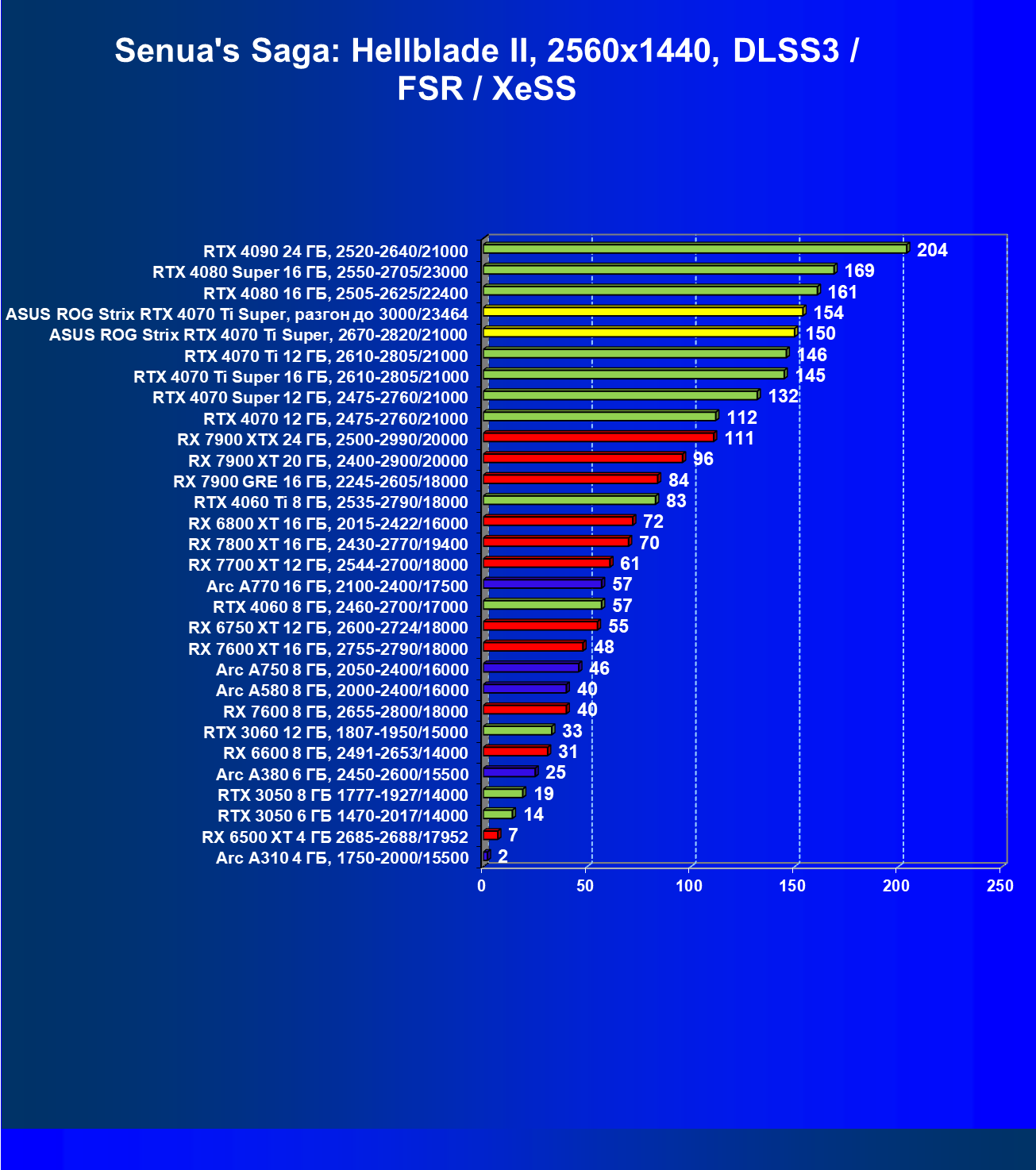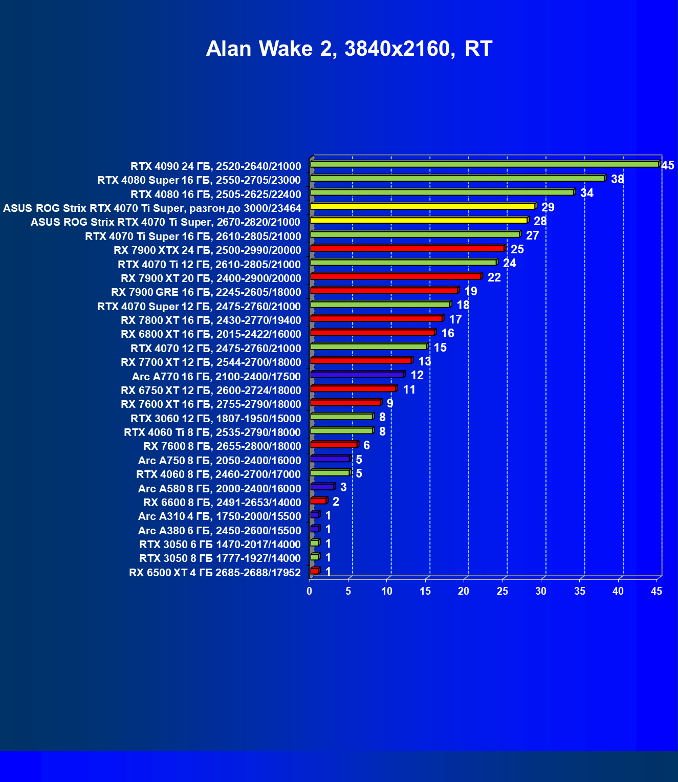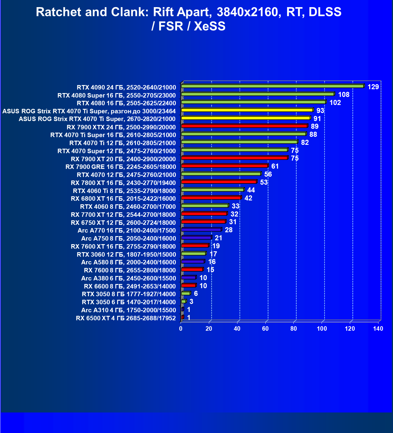 | 23 | Asus ROG Strix RTX 4070 Ti Super, разгон до 3000/23464 | 271 | 2978 | 110 000 |