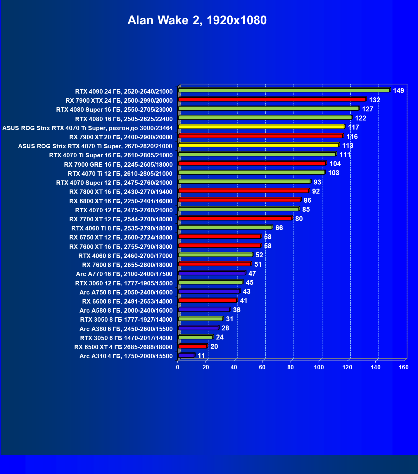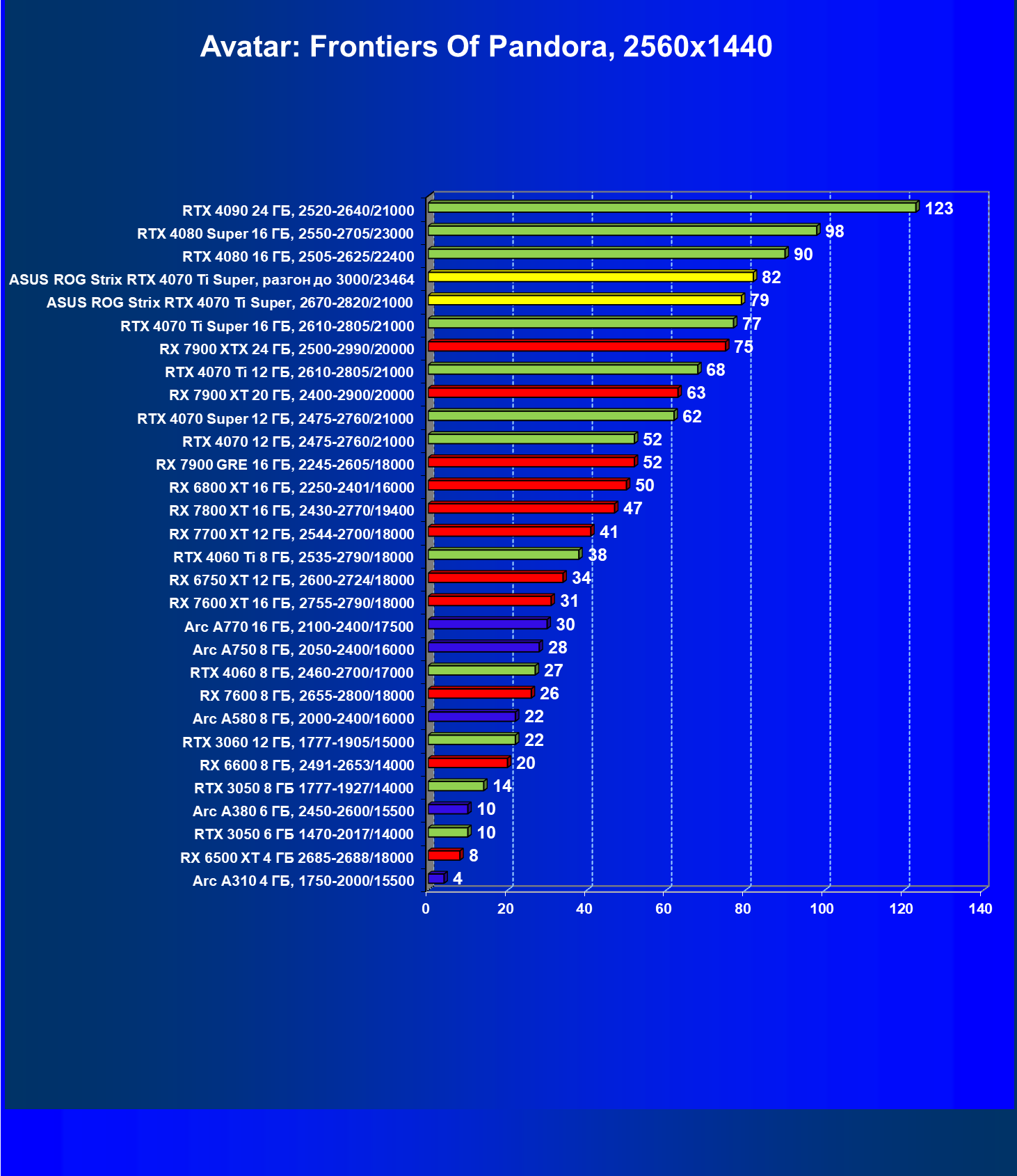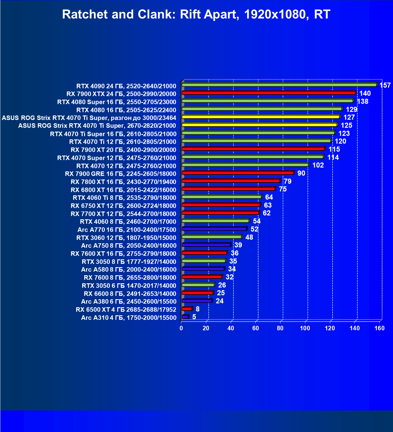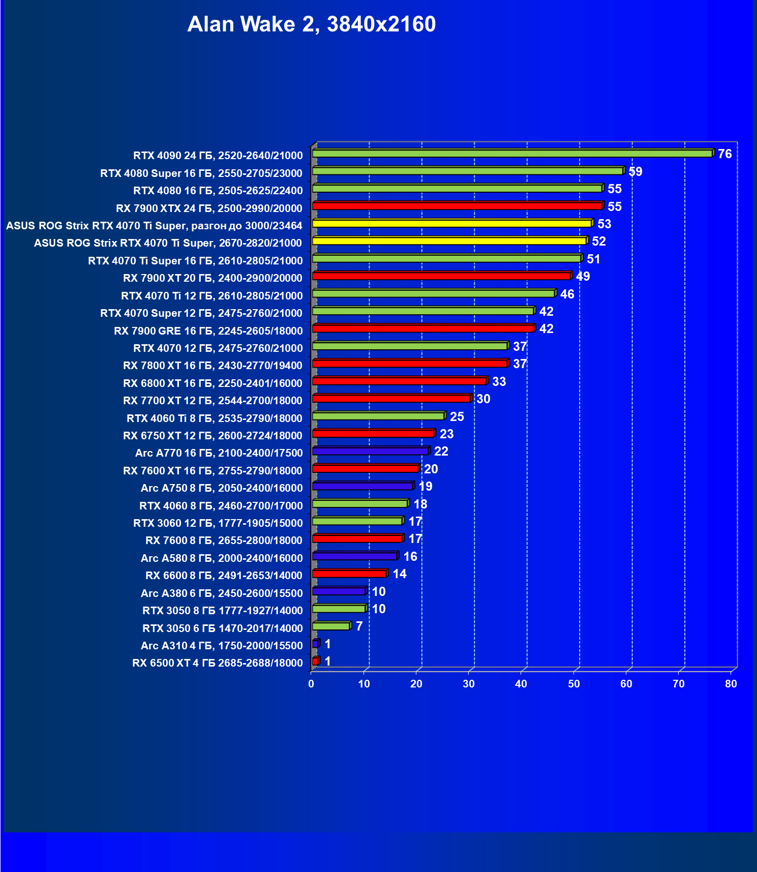 | 23 | Asus ROG Strix RTX 4070 Ti Super, разгон до 3000/23464 | 271 | 2978 | 110 000 |