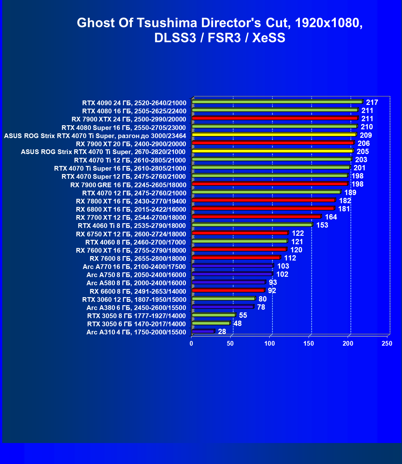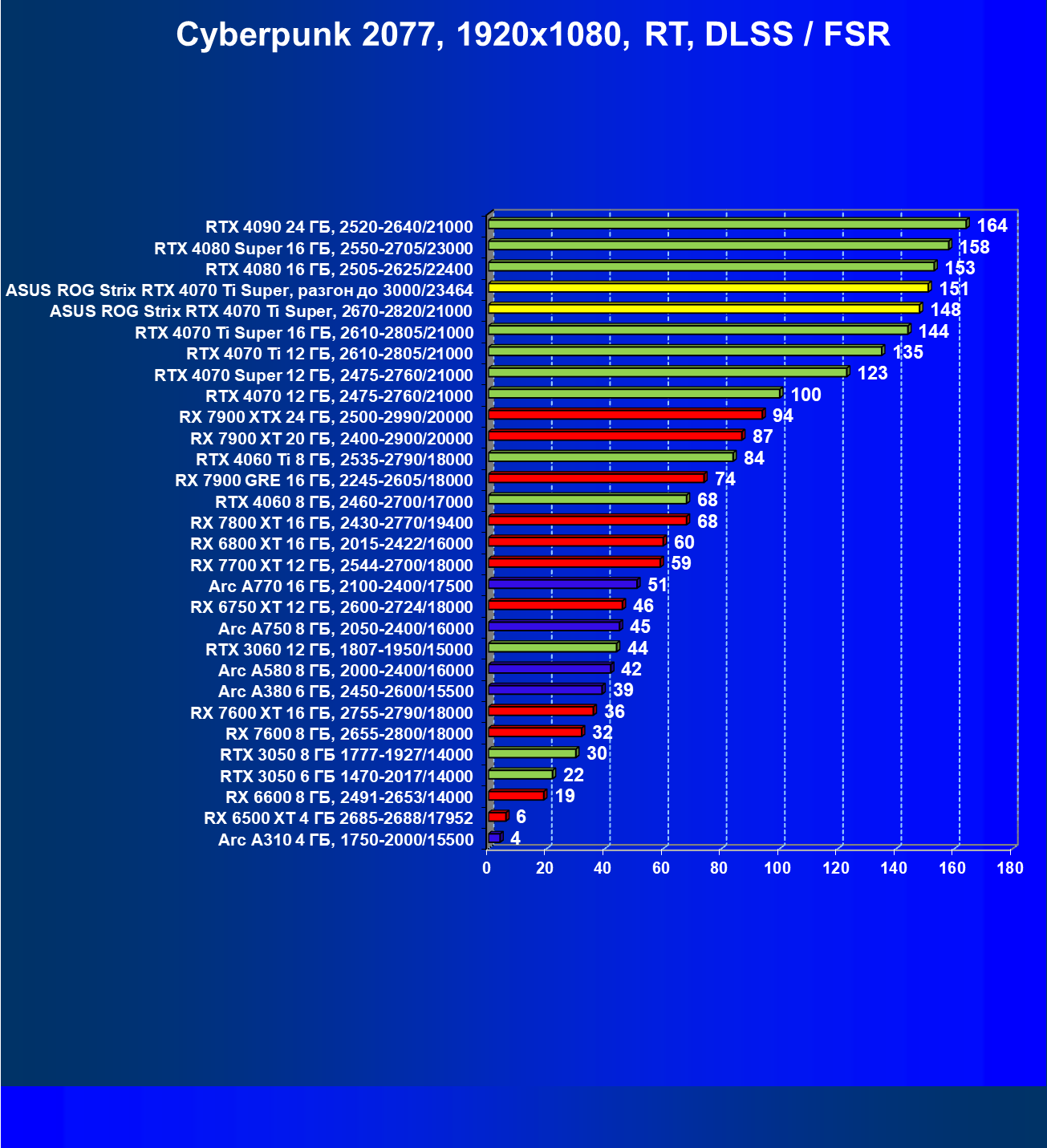 | 05 | Asus ROG Strix RTX 4070 Ti Super, разгон до 3000/23464 | 2978 | 271 | 110 000 |