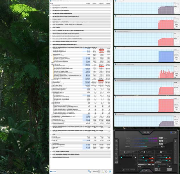 При ручном разгоне параметры нагрева и шума менялись мало (65/68 °С), но максимальное потребление выросло до 303 Вт (пиковое 354 Вт), прибавилось 5,8% производительности, при этом температура самой горячей точки ГП (hot spot) составляла 80 °C.
