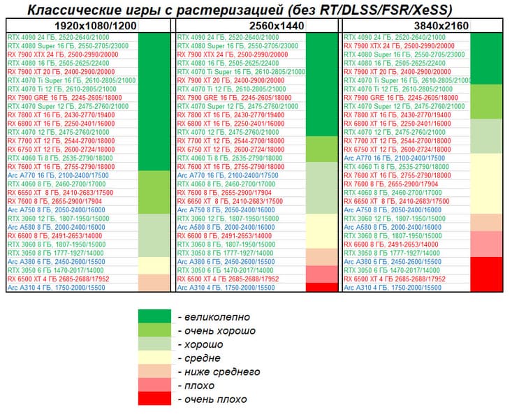 Radeon RX 7900 XT уже успел неплохо упасть в цене, поэтому в классических играх обошел GeForce RTX 4070 Ti Super по привлекательности, а карта Asus из-за очень завышенной стоимости — в аутсайдерах (есть даже более дешевые варианты GeForce RTX 4080). Впрочем, данный продукт Asus предназначен для оверклокеров и энтузиастов, а это всегда сказывается в цене.