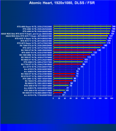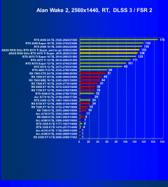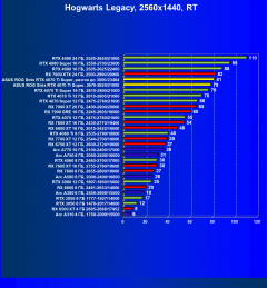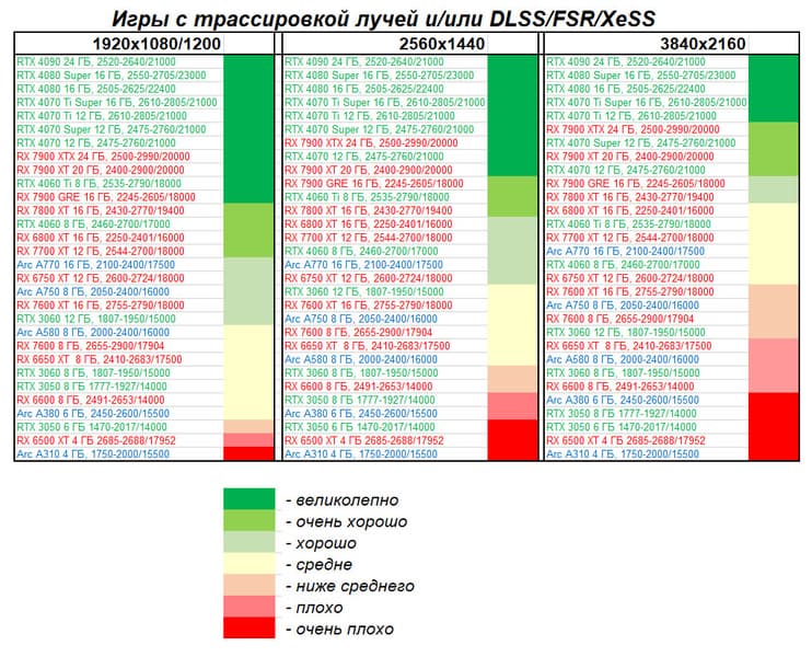 Результаты тестов со включенной аппаратной трассировкой лучей и/или DLSS/FSR/XeSS в разрешениях 1920×1080, 2560×1440 и 3840×2160