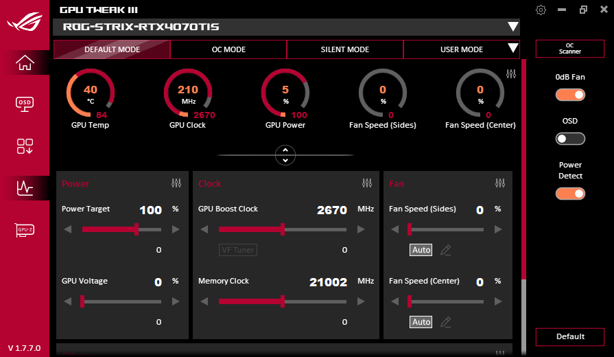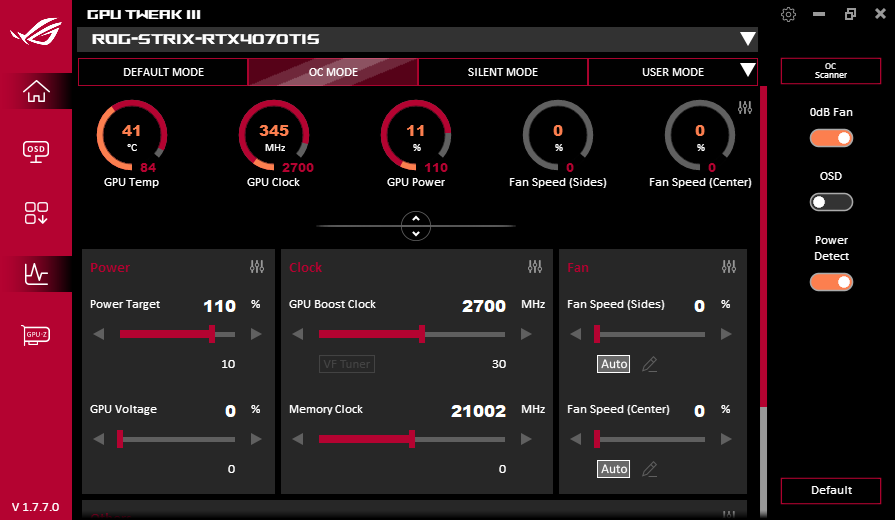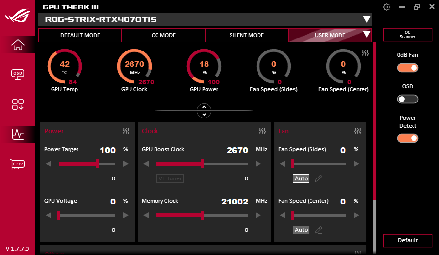 В простое режимы Performance Mode и Quiet Mode совершенно не отличались: в 2D температура была не выше 32 °C, вентиляторы не работали, уровень шума был равен фоновому — 18 дБА.