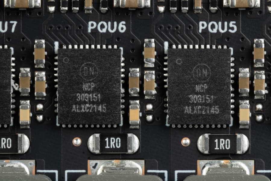В преобразователе питания, традиционно для всех видеокарт Nvidia, используются транзисторные сборки DrMOS — в данном случае NCP303151 (On Semi), каждая из которых рассчитана максимально на 50 А.