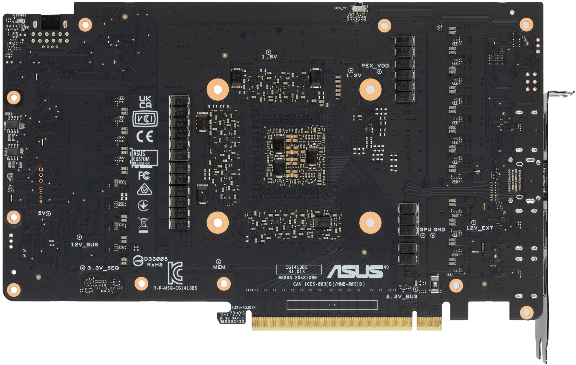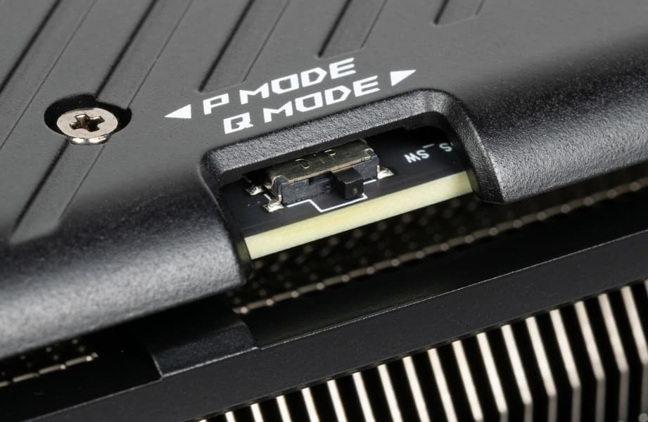 Карта имеет двойной BIOS, что уже традиционно для топовых решений Asus. На торце карты есть переключатель версий BIOS (они названы Performance mode (PMode) и Quiet mode (QMode) — производительный и тихий режимы). Разница между режимами заключается, по сути, только в оборотах вентиляторов.