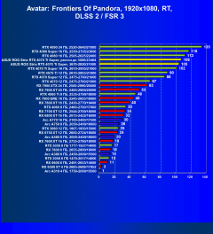 Конечно же, львиная доля продвинутых пользователей, отдавая приличные деньги за такие дорогие ускорители, будет использовать в играх максимальные настройки графики, включая и трассировку лучей. А в этом случае все конкуренты из стана AMD сильно отстают. GeForce RTX 4070 Ti Super в среднем опережает GeForce RTX 4070 Ti почти на 11%, но уступает 13% старшему GeForce RTX 4080. Карта Asus за счет фабричного и ручного разгона приблизилась к GeForce RTX 4080, но разница между ними всё равно значительная.
