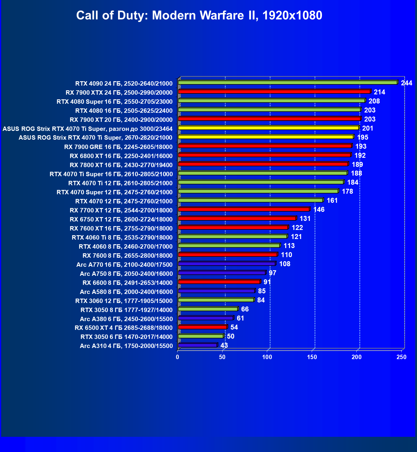 | 25 | Asus ROG Strix RTX 4070 Ti Super, 2670—2820/21000 | 263 | 2896 | 110 000 |