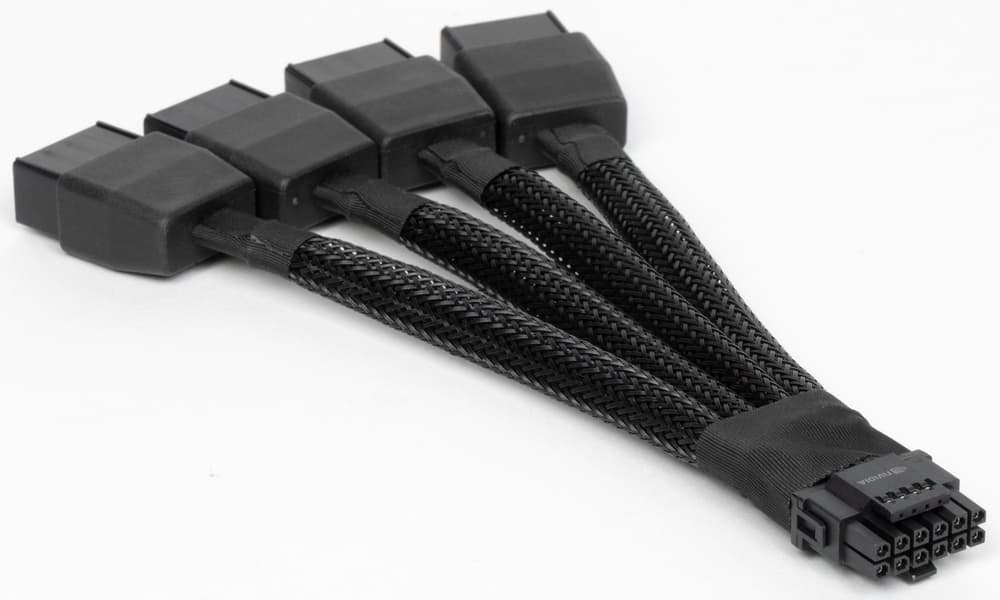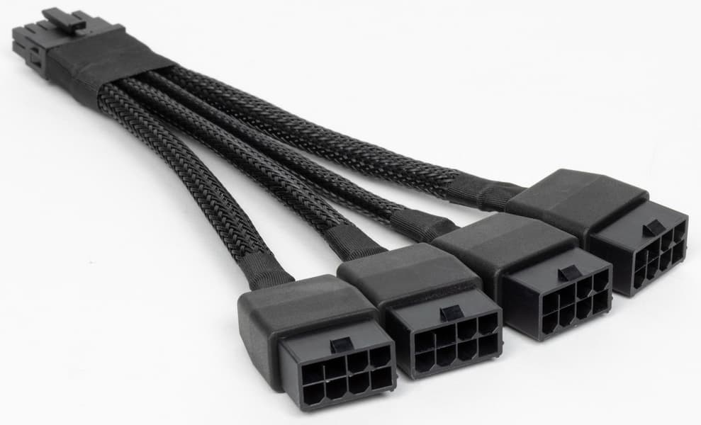 Несмотря на, казалось бы, очень толстые оплетенные кабели и наличие оплетки у входа в 16-контактный разъем, данный адаптер крайне не рекомендуется сгибать в месте той самой оплетки, ибо на входе в разъем по стандарту PCIe 5.0 находится микросхема, задействующая два управляющих контакта в разъеме. C учетом размеров данной карты мы еще раз рекомендуем приобретать полноценные БП ATX 3.0 с разъемом 12VHPWR и кабелем с 16 контактами для видеокарт новых поколений.