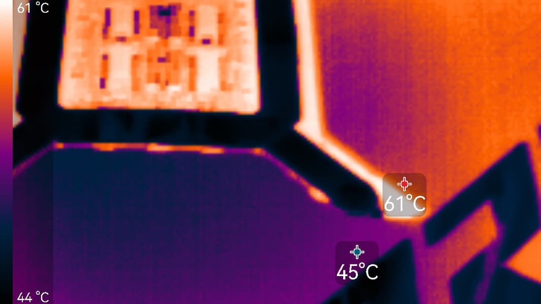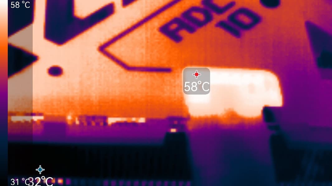 Максимальный нагрев наблюдался в центральной части PCB, а также около разъема питания. Стоит обратить внимание на переходник питания с четырех 8-контактных разъемов на один 16-контактный, который входит в комплект поставки.