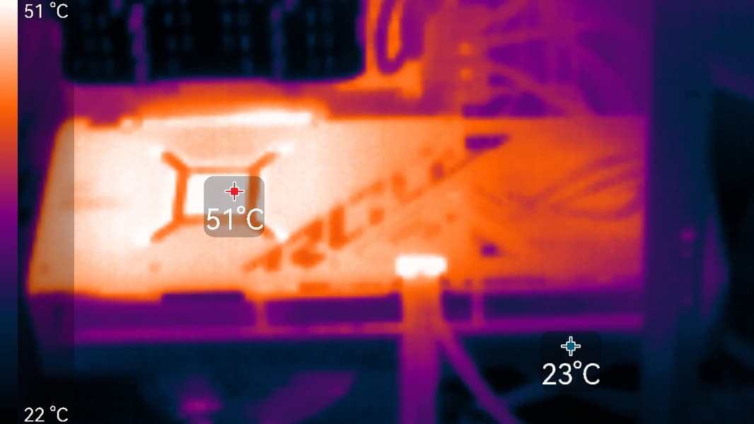После 2-часового прогона под нагрузкой максимальная температура ядра не превысила 65 градусов (самой горячей точки — 76 °C), а температура микросхем памяти — 70 градусов, что является просто великолепным результатом для видеокарт такого флагманского уровня! Энергопотребление карты доходило до 536 Вт в пиковом разовом значении и 465 Вт в остальных случаях. Напомним, что безопасный предел нагрева памяти GDDR6X — 105 °C.