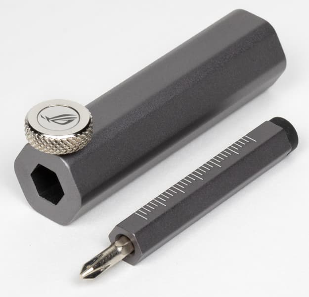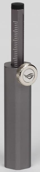 Про адаптер питания выше я уже писал, картонный пазл собирать не стал, ибо эта штука одноразовая (а другим обозревателям тоже надо показать комплект поставки в первозданном виде), так что стоит рассмотреть подставку под карту. Это устройство может играть роль как подставки, так и отвертки (крестовидной). На выдвижном стержне имеются риски для измерения длины в см. Все закрепляется боковым винтом. Максимальная высота подставки — 14 см, так что подойдет не для всех корпусов.