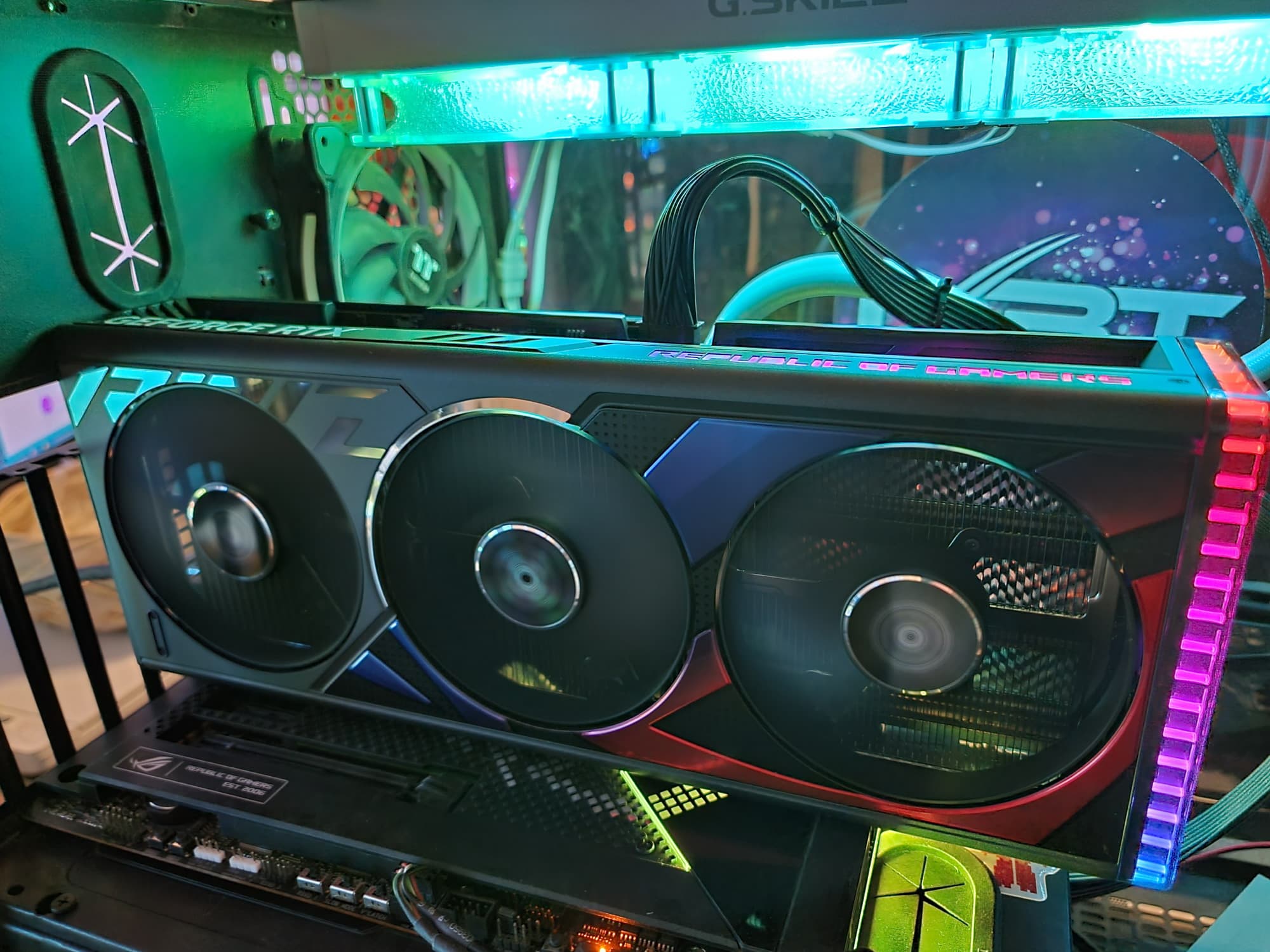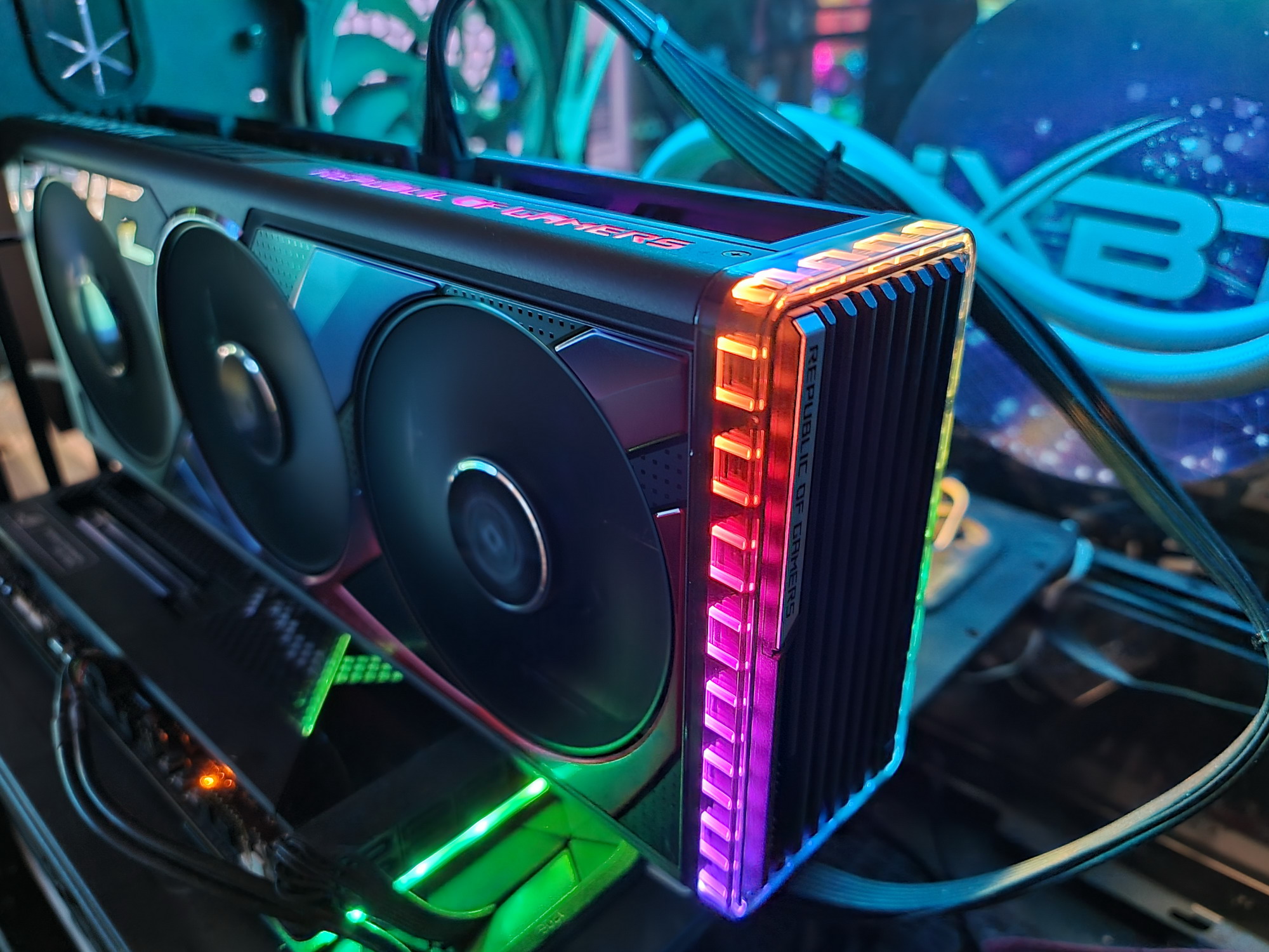 Карта имеет подсветку по ободу хвостовой части карты, а также подсвечен логотип ROG на верхнем торце.