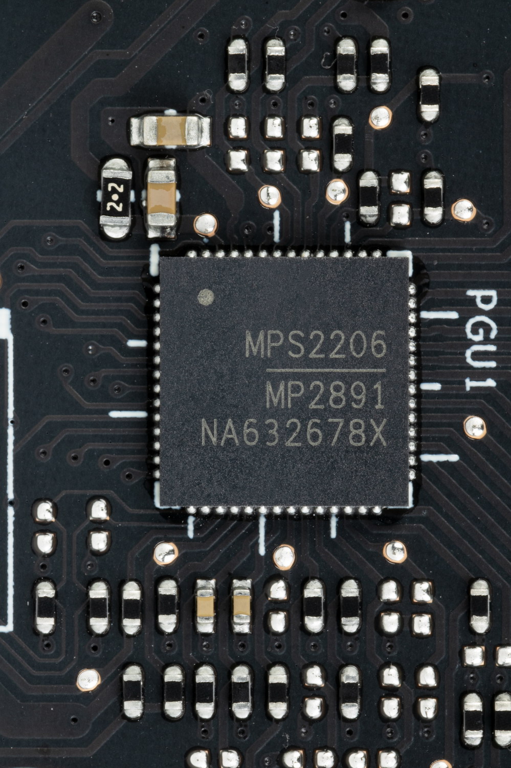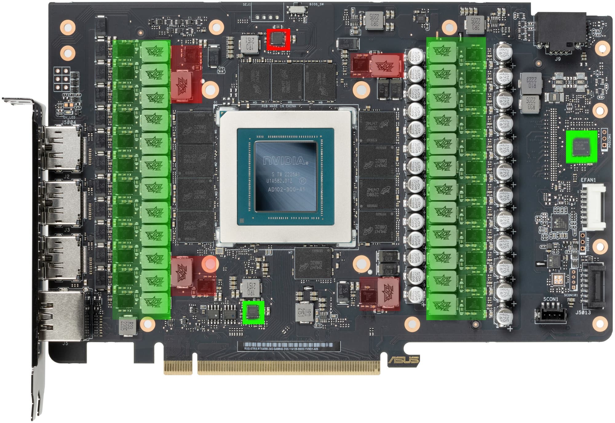 Зеленым цветом отмечена схема питания ядра, красным — памяти. Все контроллеры расположены на лицевой стороне PCB. Фазами питания ядра управляет тандем из двух ШИМ-контроллеров — MP2891 (Monolithic Power Systems) и uP9628P (uPI Semi).