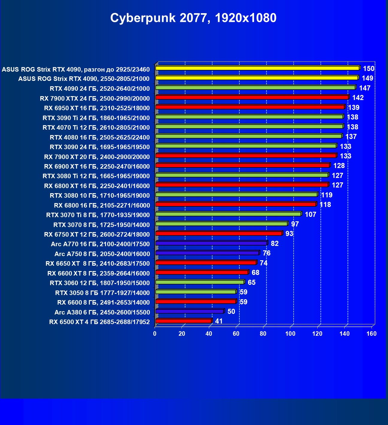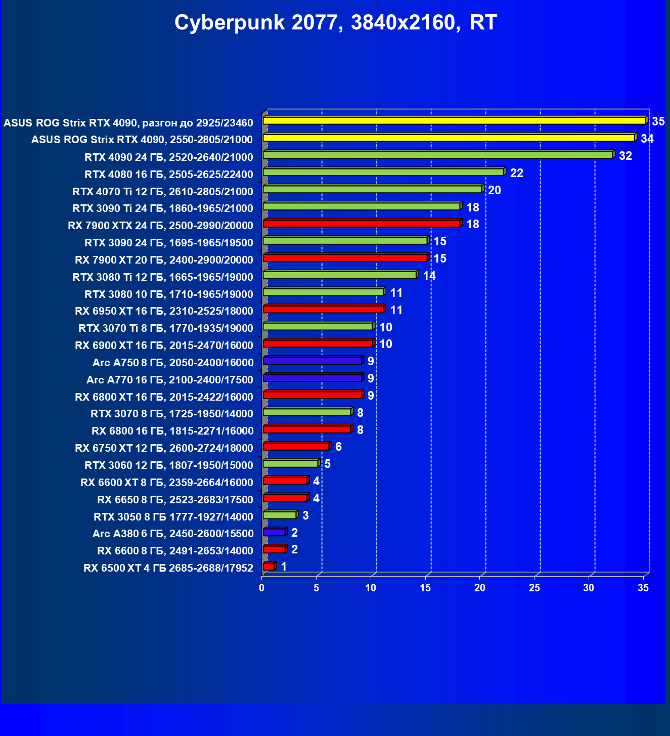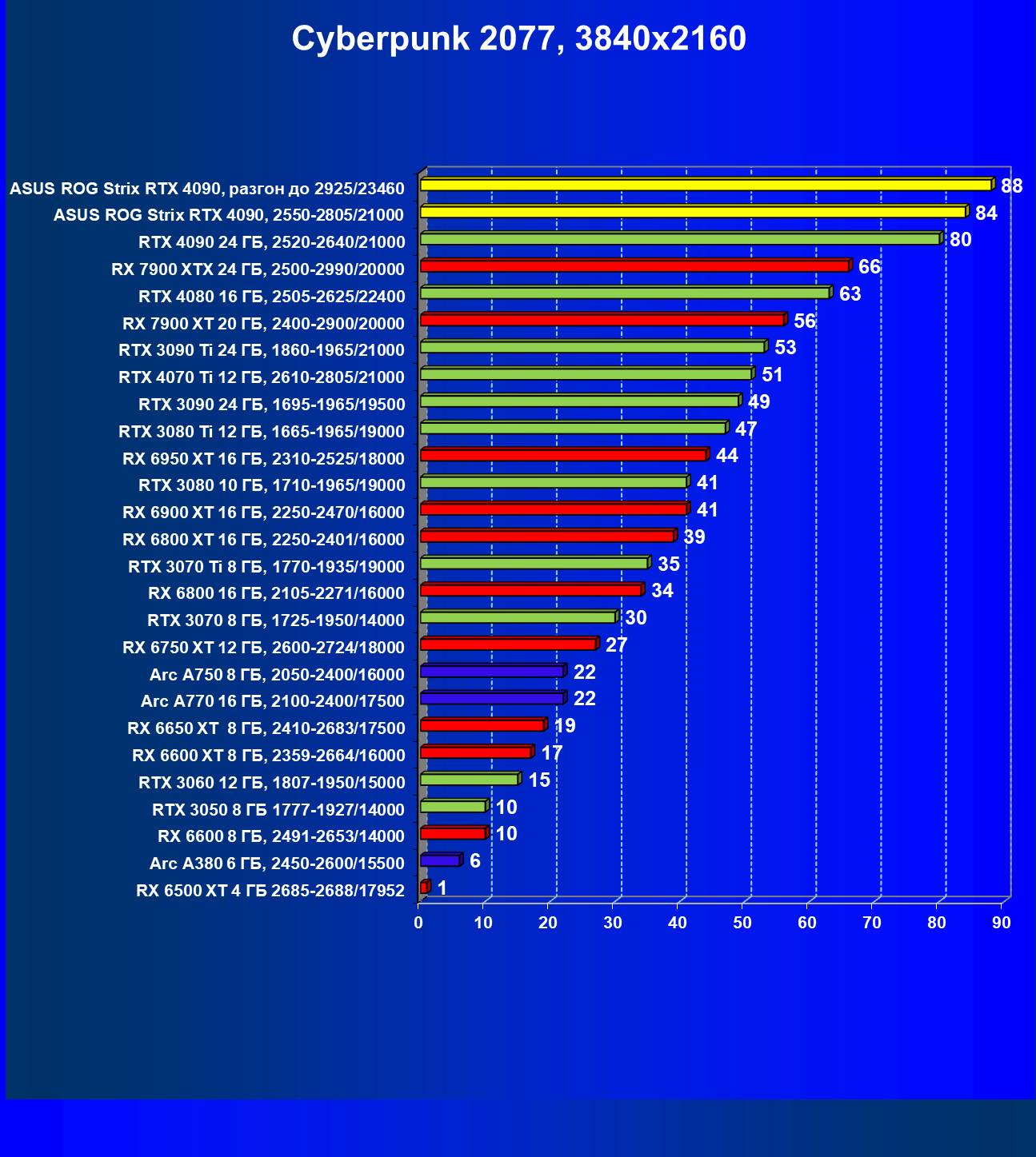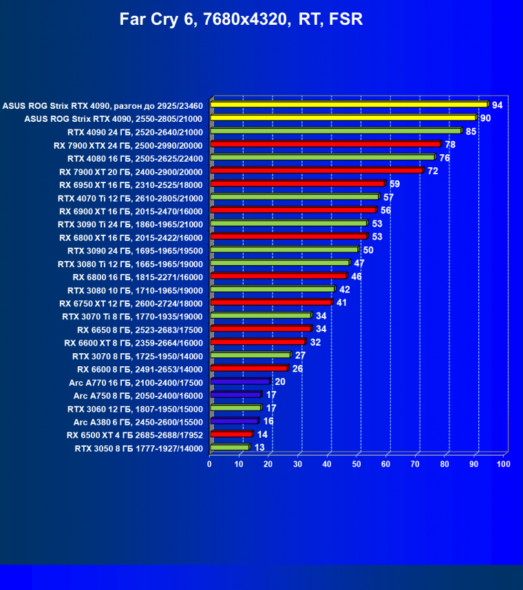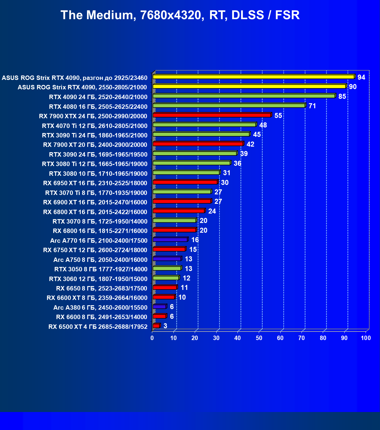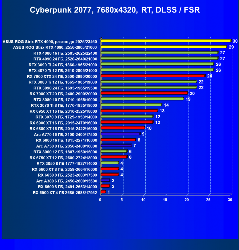 | 25 | Asus ROG Strix RTX 4090, разгон до 2925/23460 | 94 | 1878 | 200 000 |