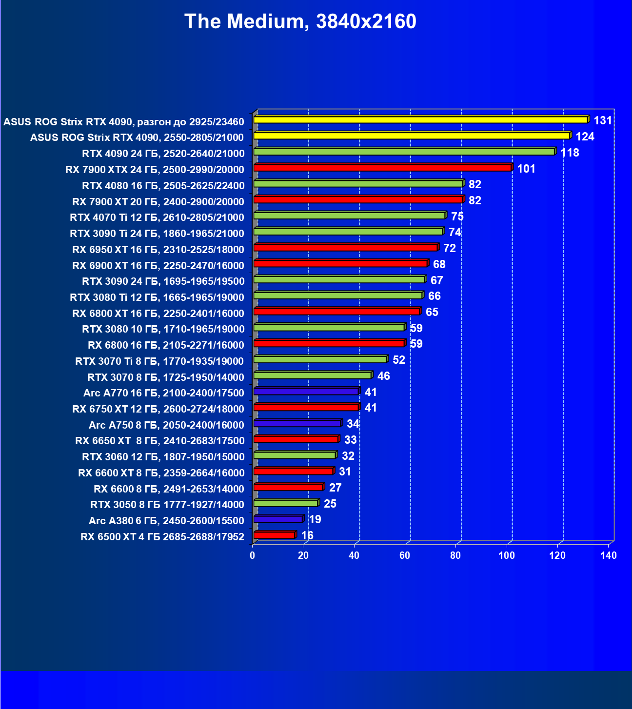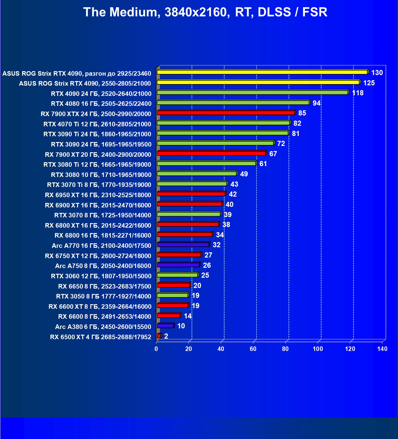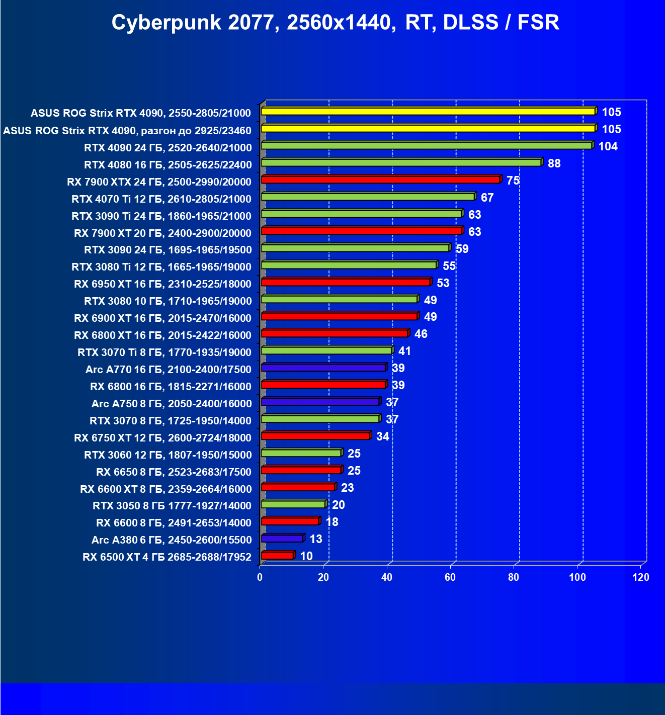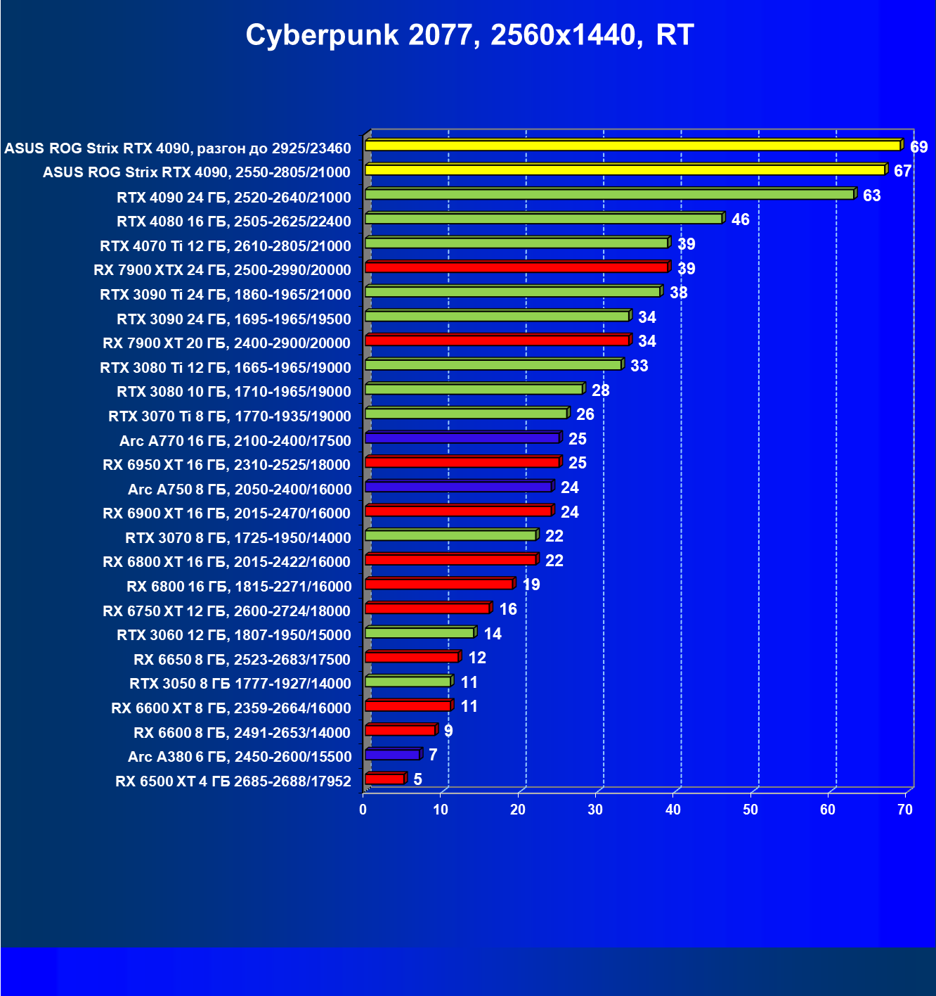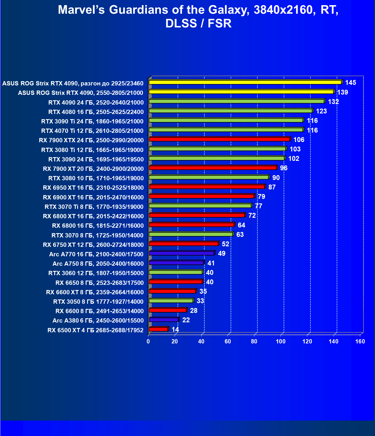 | 25 | Asus ROG Strix RTX 4090, разгон до 2925/23460 | 94 | 1878 | 200 000 |