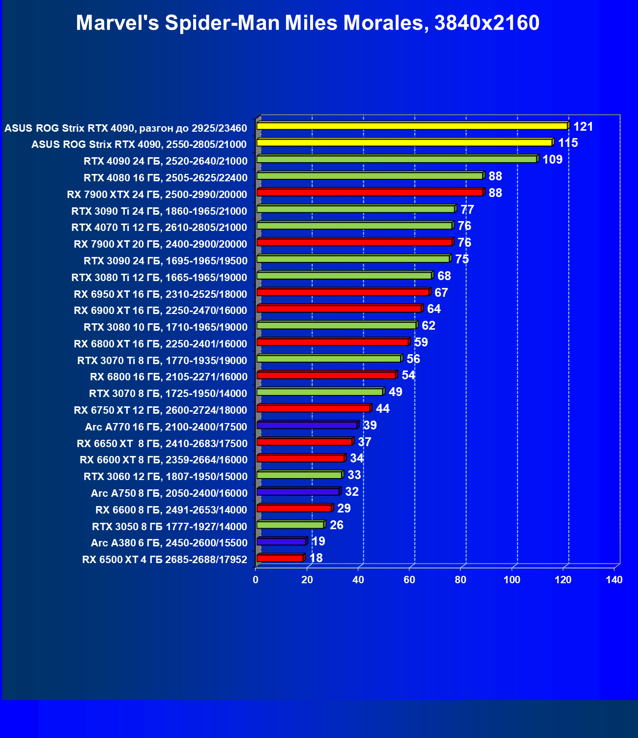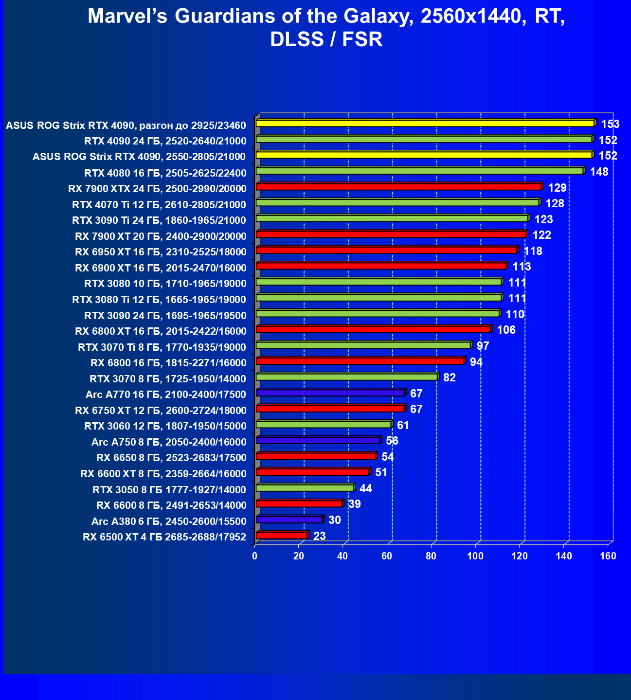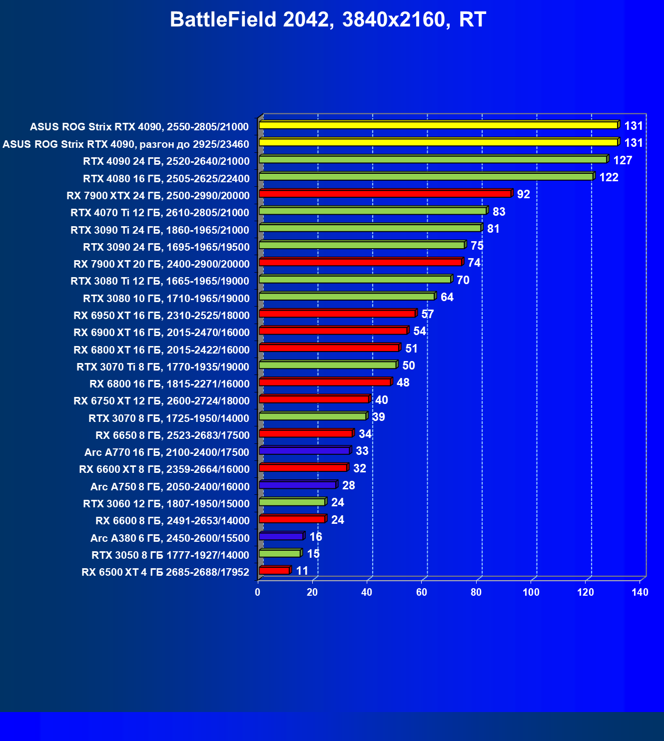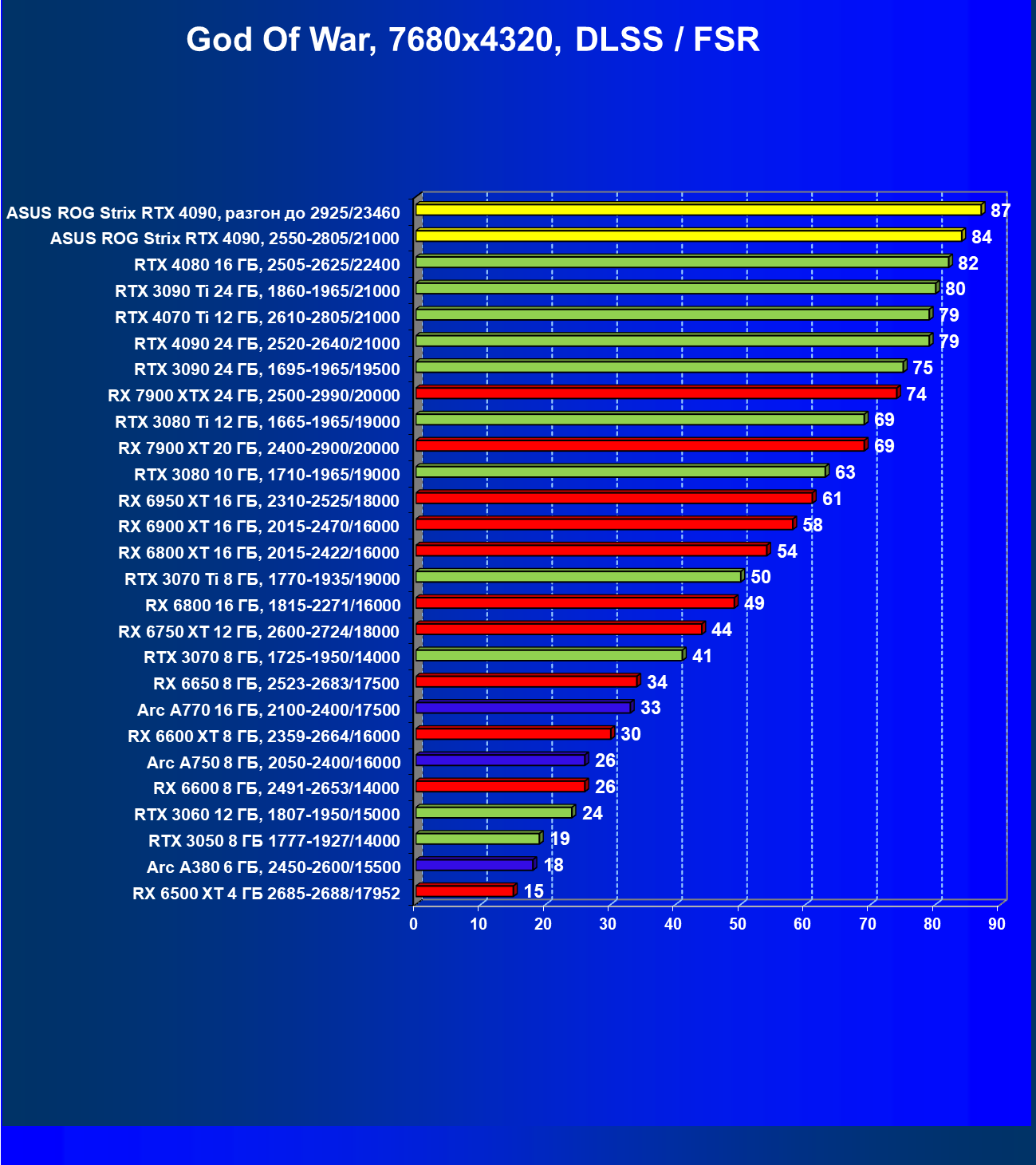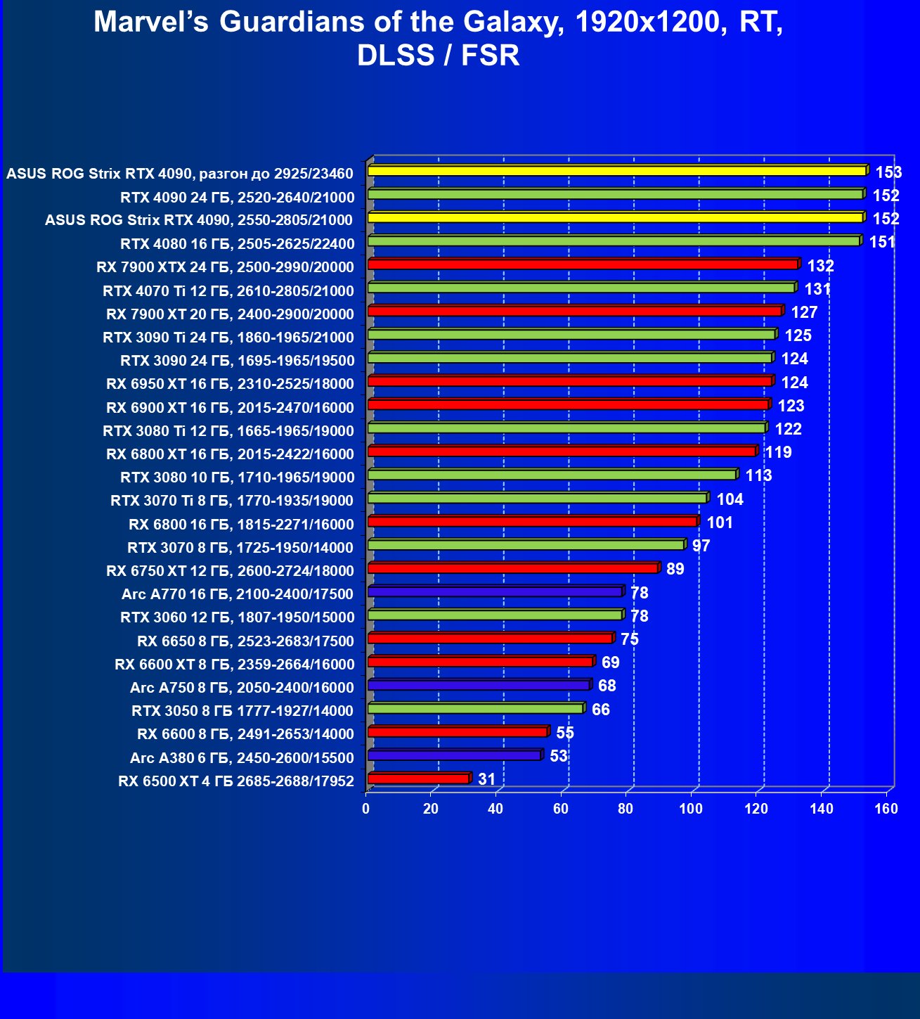 | 25 | Asus ROG Strix RTX 4090, разгон до 2925/23460 | 94 | 1878 | 200 000 |