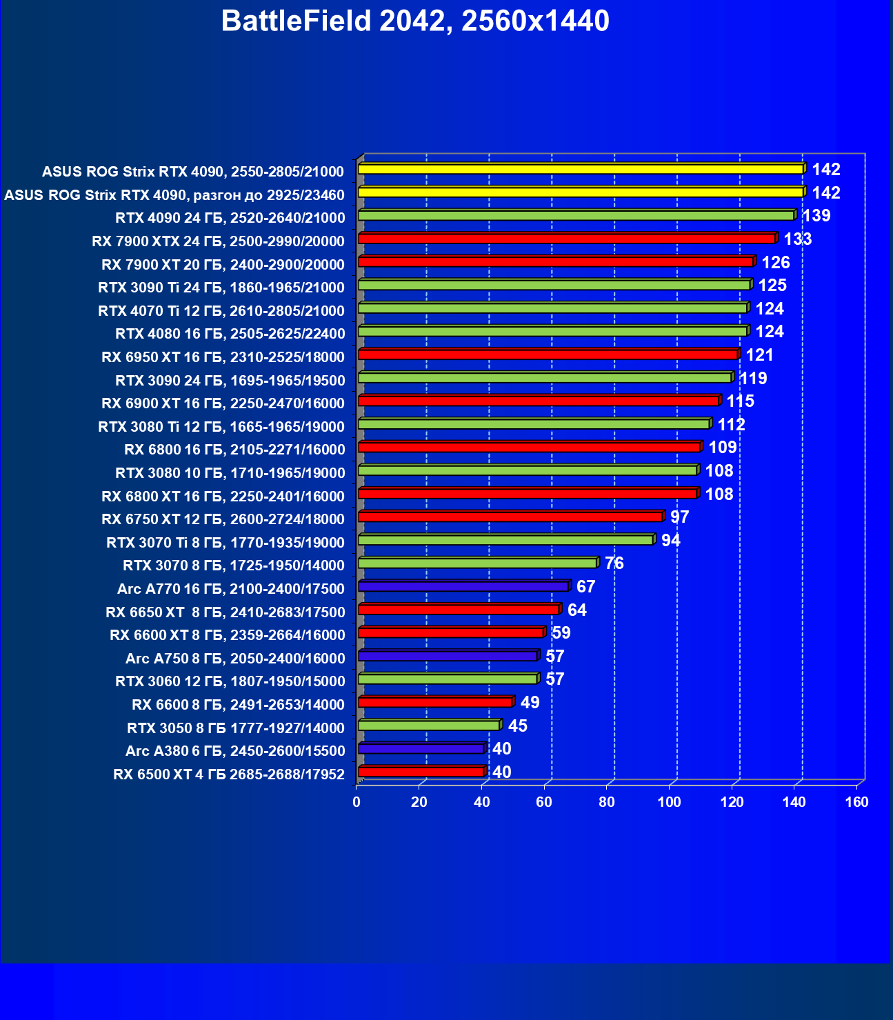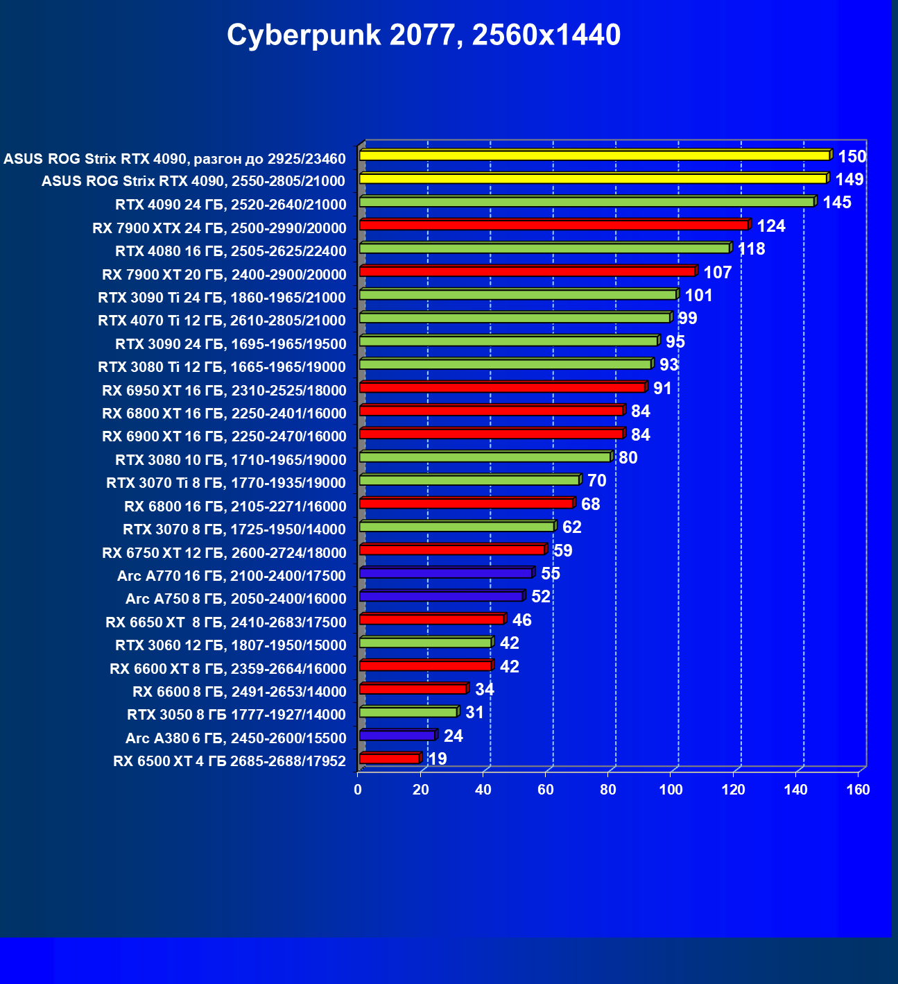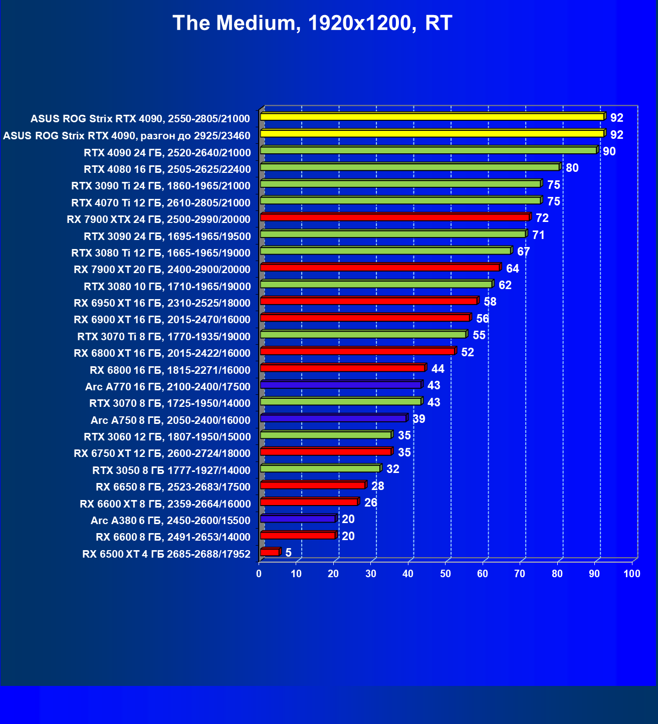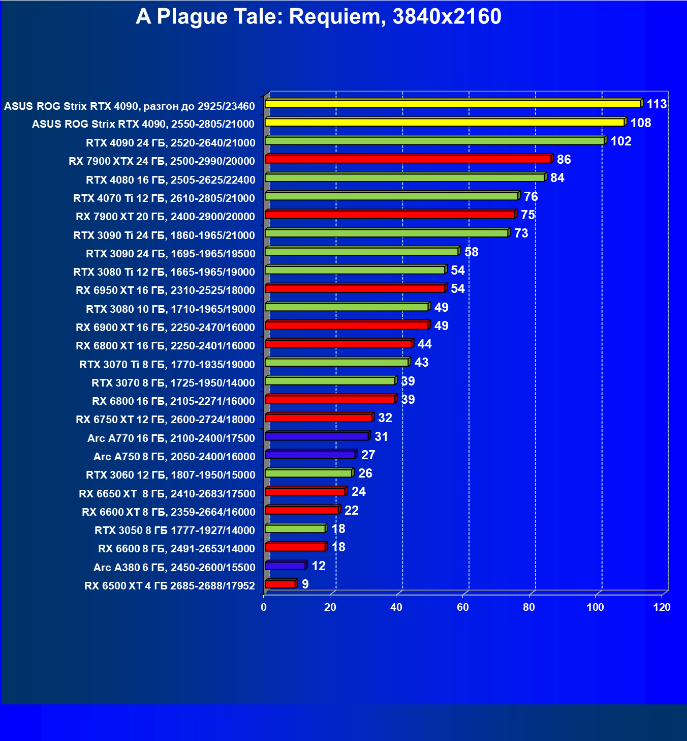 | 25 | Asus ROG Strix RTX 4090, разгон до 2925/23460 | 94 | 1878 | 200 000 |