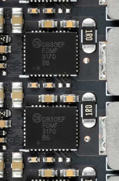 В преобразователе питания, традиционно для всех видеокарт Nvidia, используются транзисторные сборки DrMOS — в данном случае FDMF3170 (On Semi), каждая из которых рассчитана максимально на 70 А.