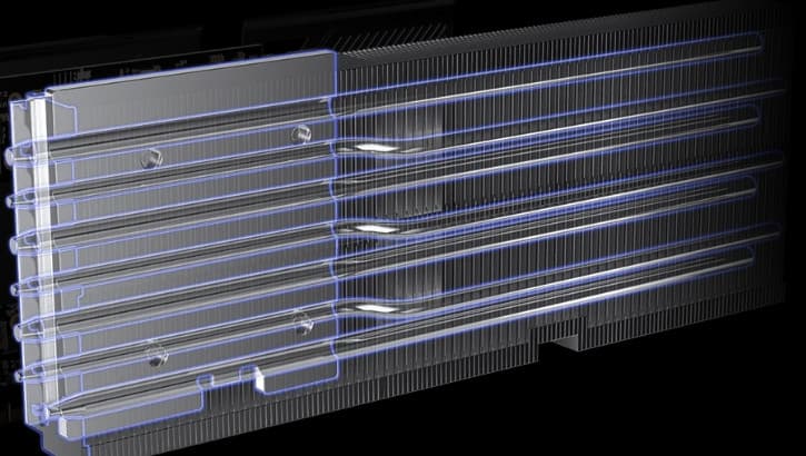 Еще при выпуске первого поколения ускорителей GeForce RTX 30 в Nvidia решили сделать у карт GeForce RTX 3080/3090 более компактную PCB и придумали новую систему охлаждения, продувающую радиатор насквозь (при этом частично оставляющую нагретый воздух в объеме корпуса). Здесь мы видим кулер, выполненный именно по этой концепции: его основой является огромный многосекционный пластинчатый никелированный радиатор с тепловыми трубками, распределяющими тепло по ребрам радиатора.