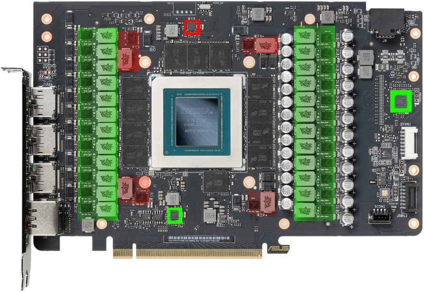 При этом распределение фаз такое: у GeForce RTX 4090 FE — 20 фаз на ядро и 3 на микросхемы памяти, у карты Palit — 16 + 3, а у карты Asus — 24 + 4.
