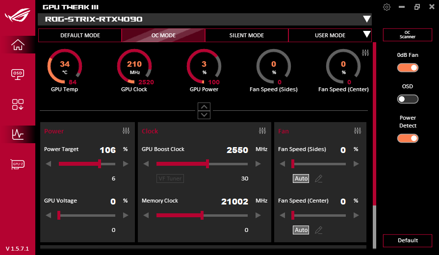 Штатные частоты памяти равны референсным значениям, а Boost-значение частоты работы ядра в обоих режимах BIOS при активации OC Mode через фирменную утилиту Asus Tweak выше референс-аналога всего на 1% (без OC Mode частоты равны). А вот максимальная частота работы ядра в BIOS PMode на 6.2% выше референс-аналога (в среднем мы получили в играх прирост производительности в 4,5% относительно референс-карты). Максимум по частоте работы ядра в BIOS QMode выше референс-аналога на 6%.