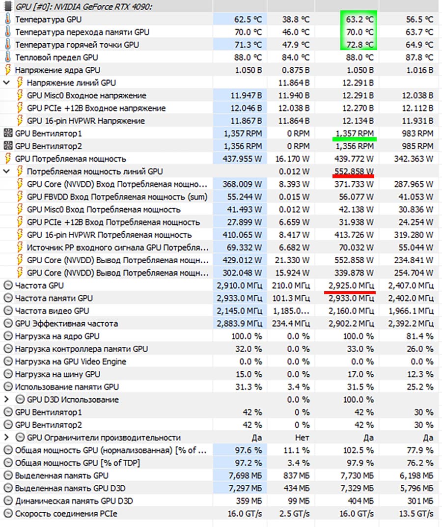 При ручном разгоне параметры нагрева и шума менялись очень мало, максимальное потребление выросло до 552 Вт в пике, 470 Вт в большинстве случаев.