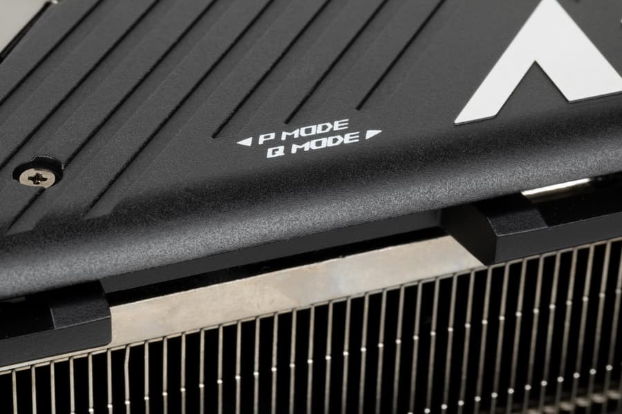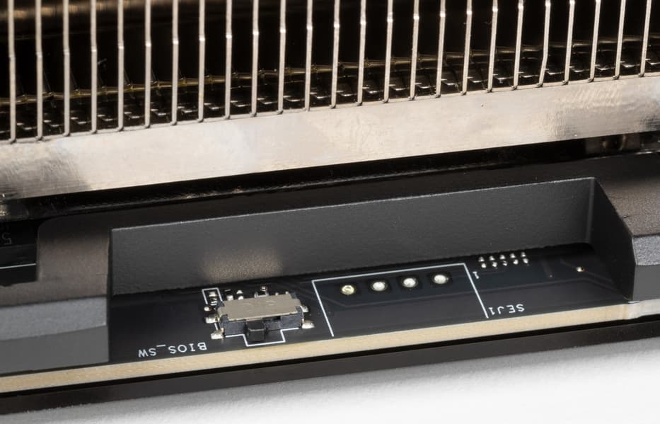 Карта имеет двойной BIOS, что уже традиционно для топовых решений Asus. На торце карты есть переключатель, в разных версиях BIOS (они названы Performance mode (PMode) и Quiet mode (QMode) — производительный и тихий режимы). Разница между режимами заключается не только в оборотах вентиляторов, также у GPU в этих режимах немного разные максимальные частоты. При этом предел энергопотребления для обеих версий BIOS заложен в 600 Вт.