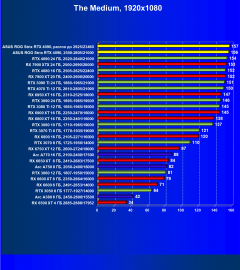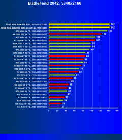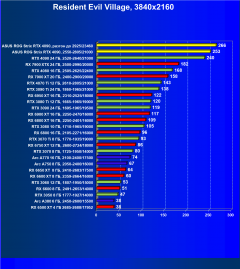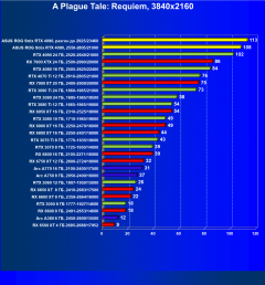 Я думаю, что диаграмма выше всё прекрасно демонстрирует: даже в разрешении 4K во многих играх общая производительность ограничивается уже не видеокартой, а другими компонентами системы, чаще всего упирается в возможности центрального процессора (даже Core i9-12900K не способен угнаться за GeForce RTX 4090, причем в 4K!). Что касается карты Asus, то, несмотря на то, что у нас вариант не ОС, она все равно чуть быстрее референс-аналога.