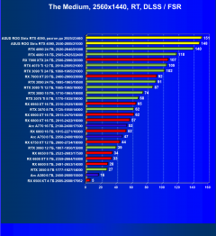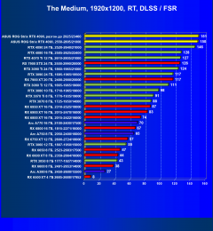 Рейтинг составлен по 9 тестам, в которых используется технология трассировки лучей и одновременно технология Nvidia DLSS или AMD FSR. Этот рейтинг нормирован по самому слабому ускорителю в данной группе — Radeon RX 6500 XT (то есть сочетание скорости и функций Radeon RX 6500 XT приняты за 100%).