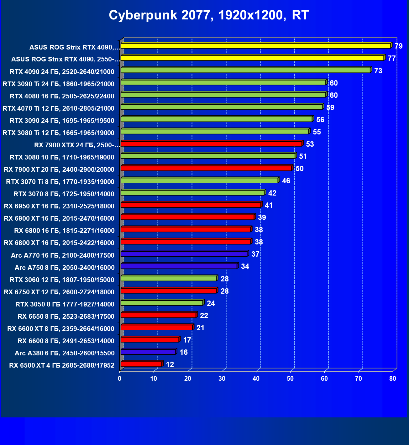 | 11 | RX 6950 XT 16 ГБ, 2310—2525/18000 | 652 | 78 | 83 100 |