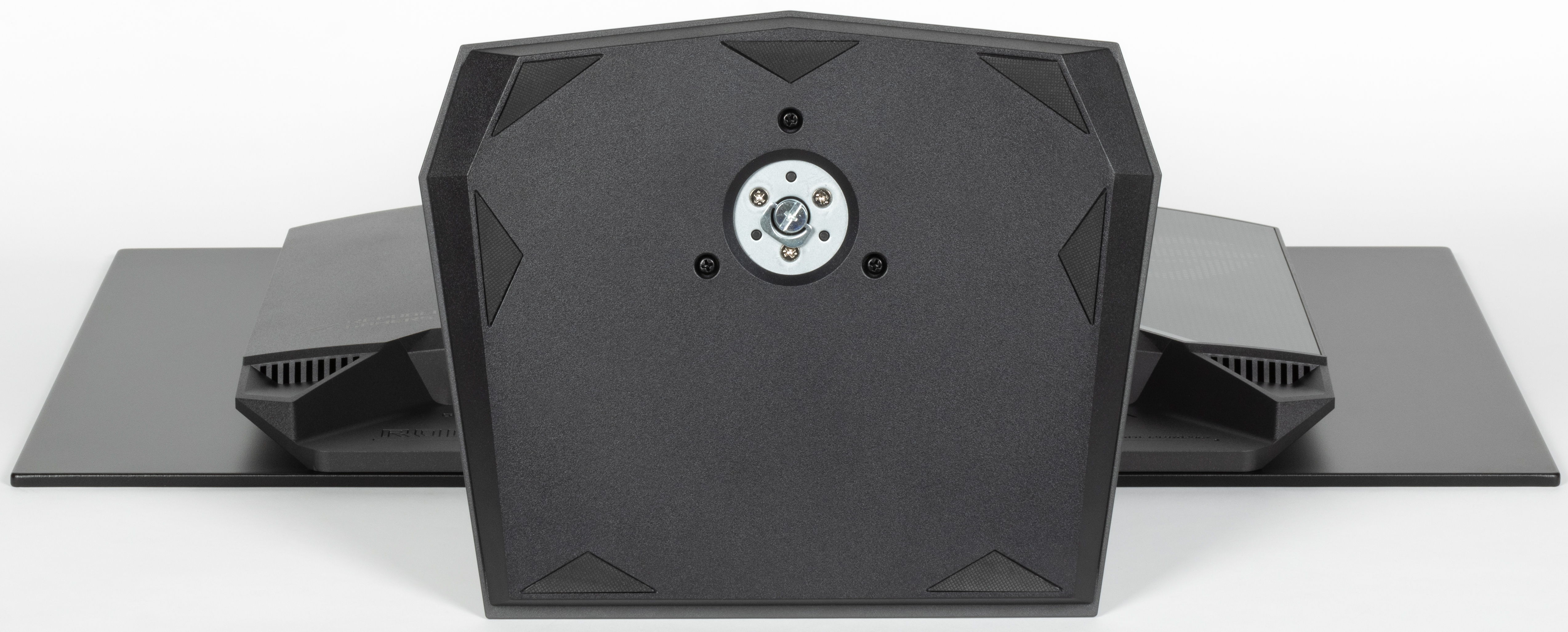 На штатной подставке монитор стоит устойчиво. Несущие элементы подставки изготовлены из толстой штампованной стали и алюминиевого сплава. Конструкция подставки достаточно жесткая. Накладки из резины снизу на основании подставки защищают поверхность стола от царапин и предотвращают скольжение монитора на гладких поверхностях.
