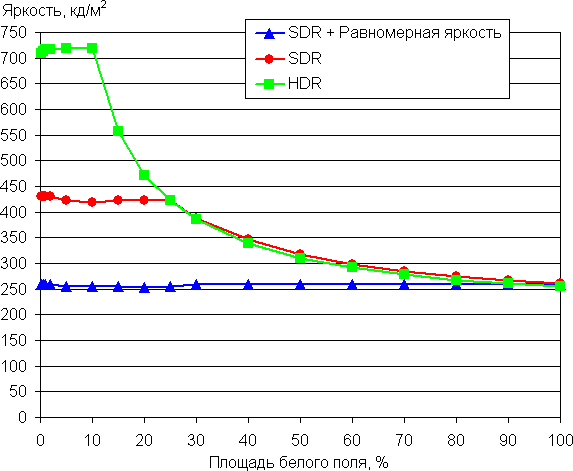 С изменением площади белого (или средней светлоты экрана) максимальная яркость также может меняться, при этом характер зависимости яркости от площади белого участка зависит как минимум от текущего режима — SDR или HDR. В случае SDR пользователь дополнительно может включить опцию Равномерная яркость, чтобы минимизировать изменение яркости в зависимости от средней светлоты экрана. Приведем зависимости яркости белого от его площади (от 0,2% до 100%) для трех режимов: