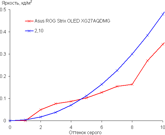 Самый близкий к черному диапазон можно не учитывать, так как в нем цветопередача не так важна, а погрешность измерения цветовых характеристик высокая. Цветовой баланс в обоих двух случаях хороший, так как цветовая температура достаточно близка к стандартным 6500 К, а ΔE ниже 10 единиц, что для потребительского (и игрового) устройства считается хорошим показателем. При этом оба параметра мало изменяются на различных участках шкалы серого, что улучшает визуальное восприятие цветового баланса.