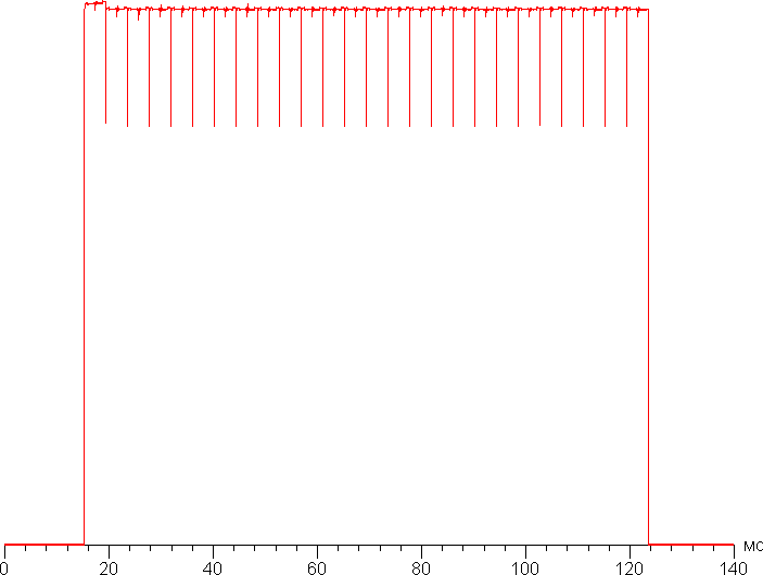На любом уровне яркости видимое мерцание отсутствует, его не выявляет и тест на стробоскопический эффект. Регистрация зависимости яркости от времени при различных уровнях яркости выявила модуляцию яркости с очень высоким коэффициентом заполнения, что и объясняет отсутствие мерцания. В доказательство приведем графики зависимости яркости (вертикальная ось) от времени (горизонтальная ось) при различных значениях настройки Яркость в случае белого поля на 10% от площади экрана.