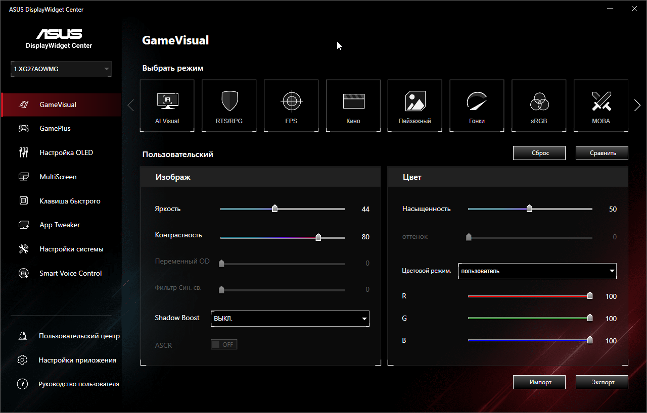 Монитором можно управлять с ПК с помощью фирменного ПО Asus DisplayWidget с развитой функциональностью.