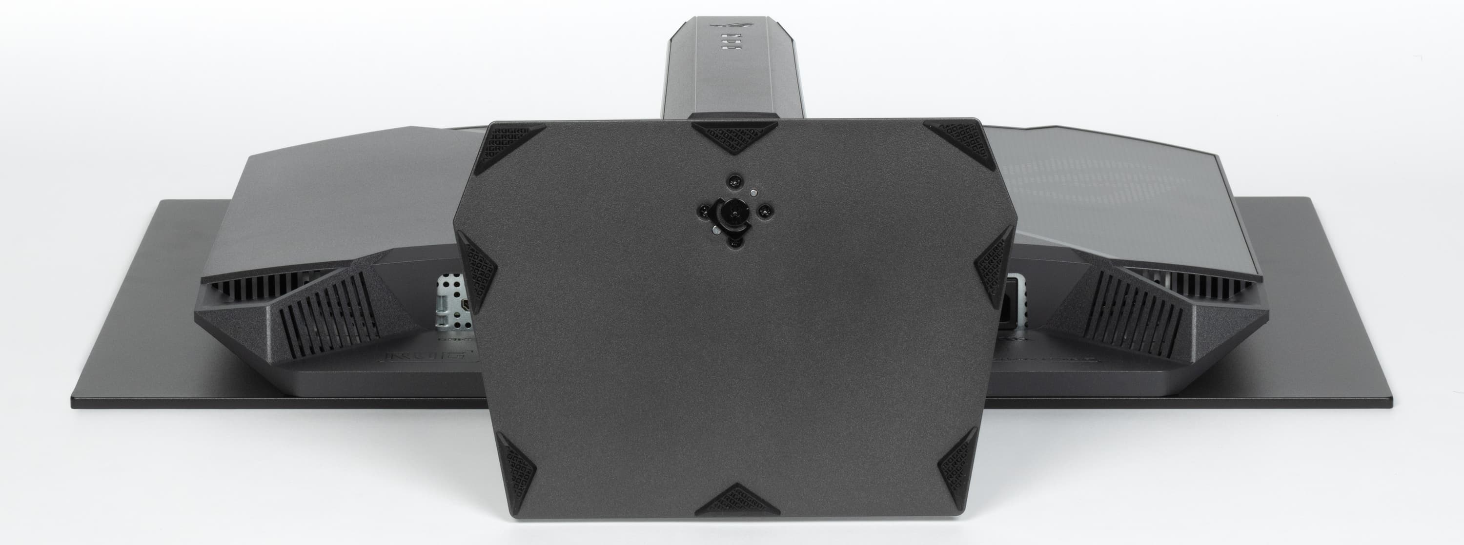 Стойка имеет фиксированную высоту, но подпираемый пружиной механизм со стальным рельсовым шариковым подшипником обеспечивает вертикальное перемещение шарнира, на который крепится блок экрана. В итоге легким движением руки экран можно установить на нужную высоту. Верхний шарнир позволяет немного наклонять блок экрана вперед от вертикального положения и больше наклонять назад, а также перевернуть в портретную ориентацию по и против часовой стрелки.