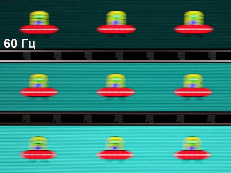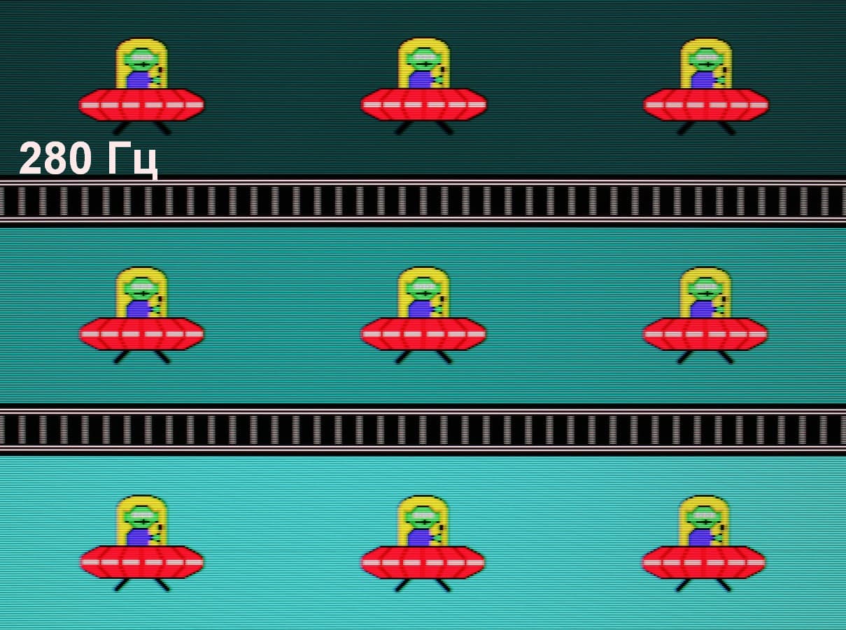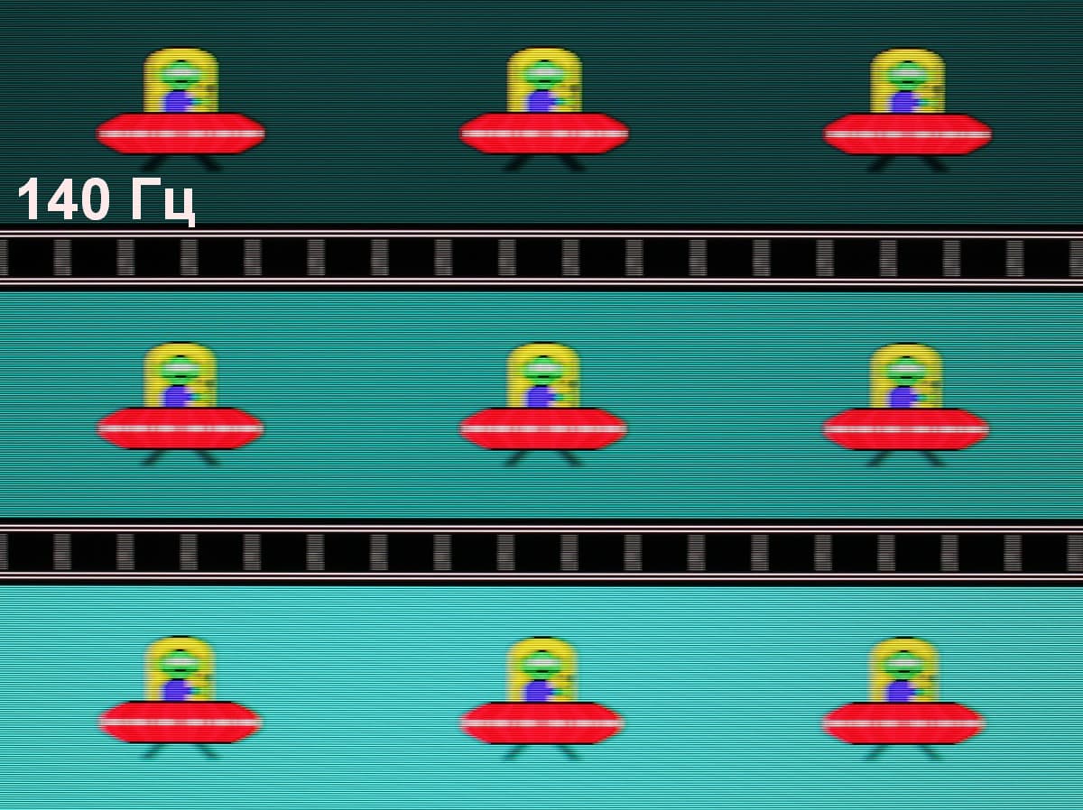 Попробуем представить, что было бы в случае матрицы с мгновенным переключением пикселей. Для нее при 60 Гц объект со скоростью движения 960 пиксель/с размывается на 16 пикселей, при 140 Гц — на 7 пикселей (скорость 980 пиксель/с), при 280 Гц — на 3 пикселя (скорость 840 пиксель/с). Размывается, так как фокус зрения движется с указанной скоростью, а объект неподвижно выводится на 1/60, 1/140 или на 1/280 секунды. Для иллюстрации этого сымитируем размытие на перечисленное количество пикселей: