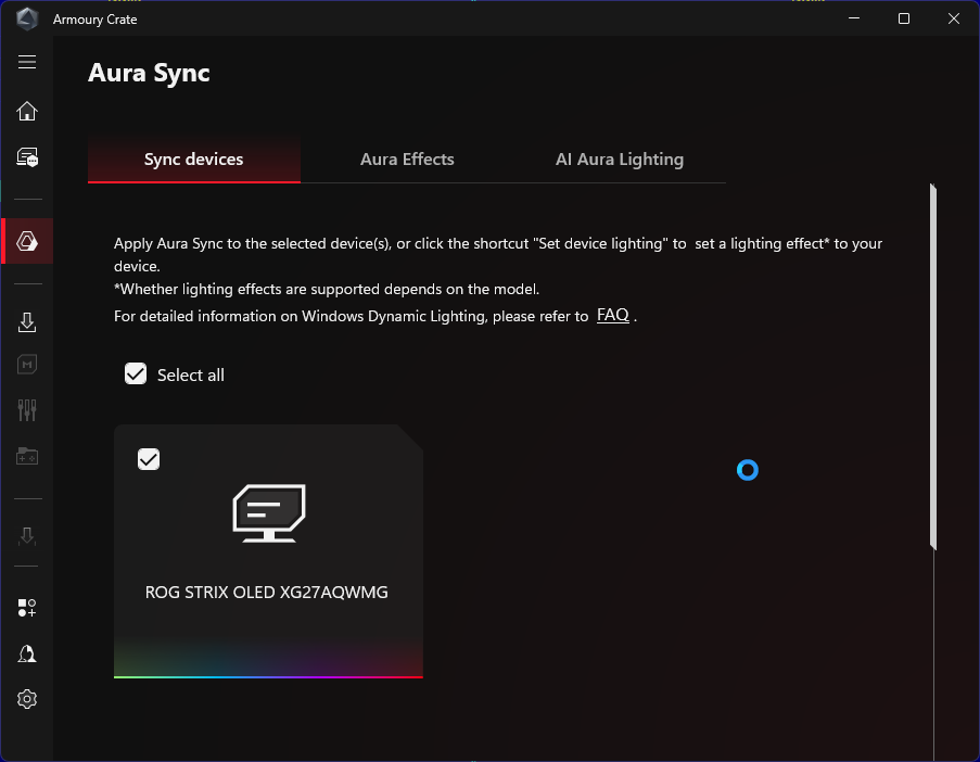 Также можно включить фирменный режим синхронизации подсветки с поддерживаемыми устройствами под названием Aura Sync. При этом для синхронизации и настройки подсветки нужно использовать фирменное приложение Armoury Crate.