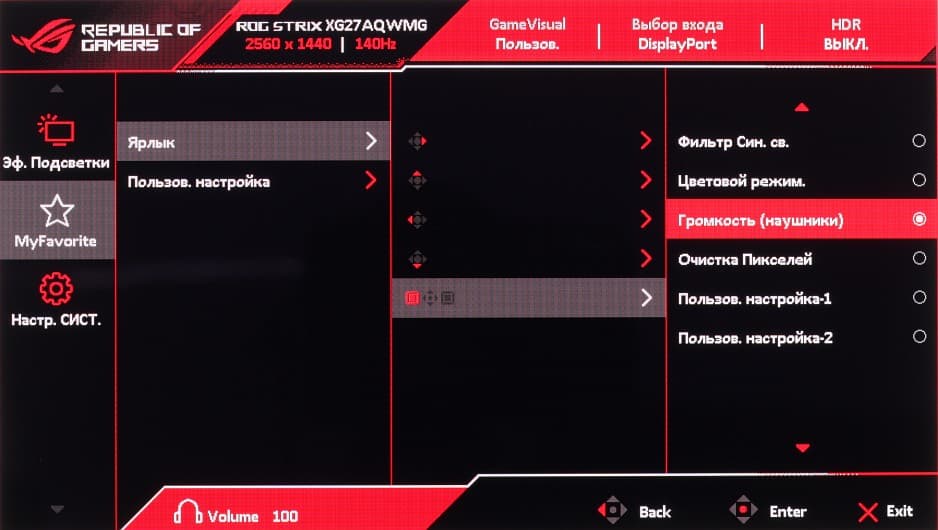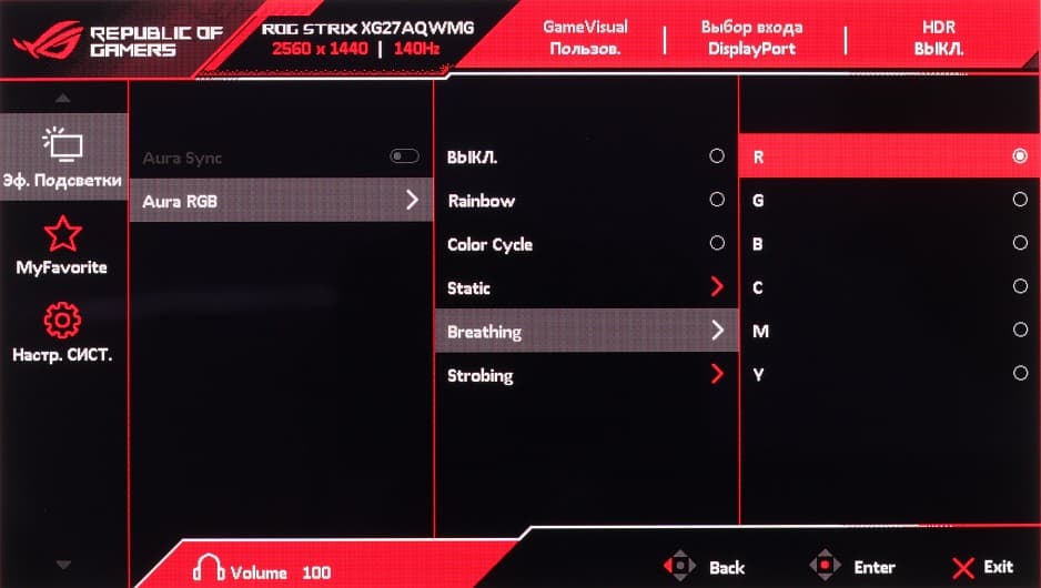 В меню монитора декоративную подсветку на задней панели можно отключить или выбрать для нее один из нескольких динамичных эффектов или статичный вариант с указанным цветом.