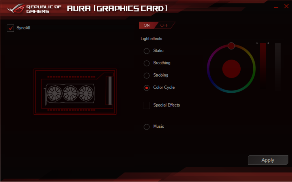 Правда, подсветка тут чисто формальная: у карты светится лого ROG на торце сверху. Да и выбор режимов работы подсветки, в отличие от материнских плат той же Asus, очень ограничен.